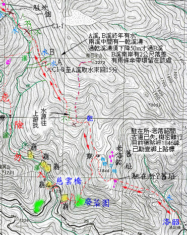 若續沿山腰獵路往西北約十分鐘至路跡不明處, 注意小溪溝附近上方(北), 有紅色路標, 往小溪溝上游約3-5分鐘可找到活水源, 除非乾旱季節, 通常有水. 過此水源溪溝, 上支稜可往無明東稜.