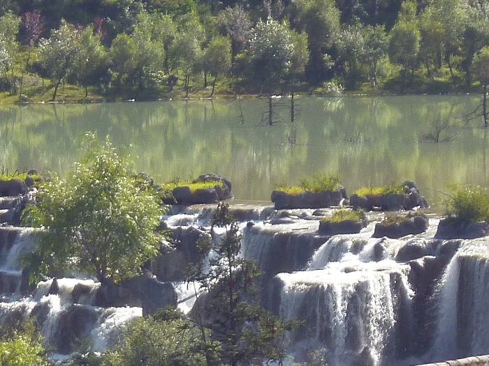 藍月谷中溪瀑清澈碧綠如絲流瀉成簾瀑