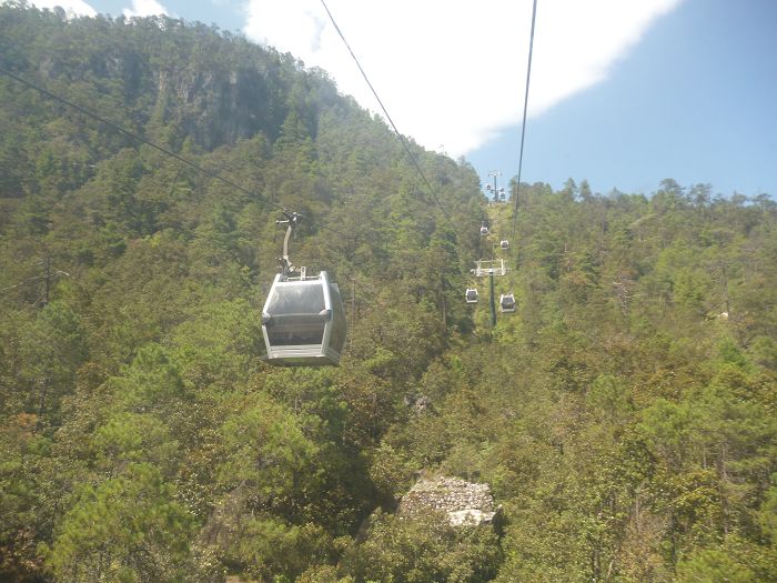 空中纜車穿雲霄,蒼翠樹群踞足下