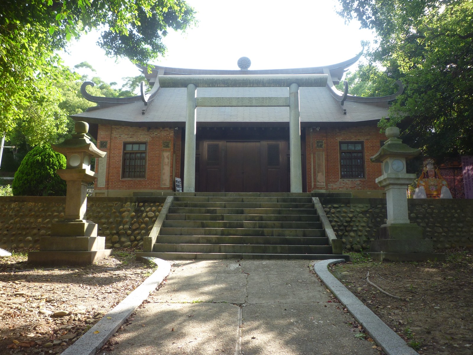 1虎頭山公園內通霄神社,為日本瓦式鳥居,結合閩南燕尾翹背風格建築,為台灣宗教百景之一