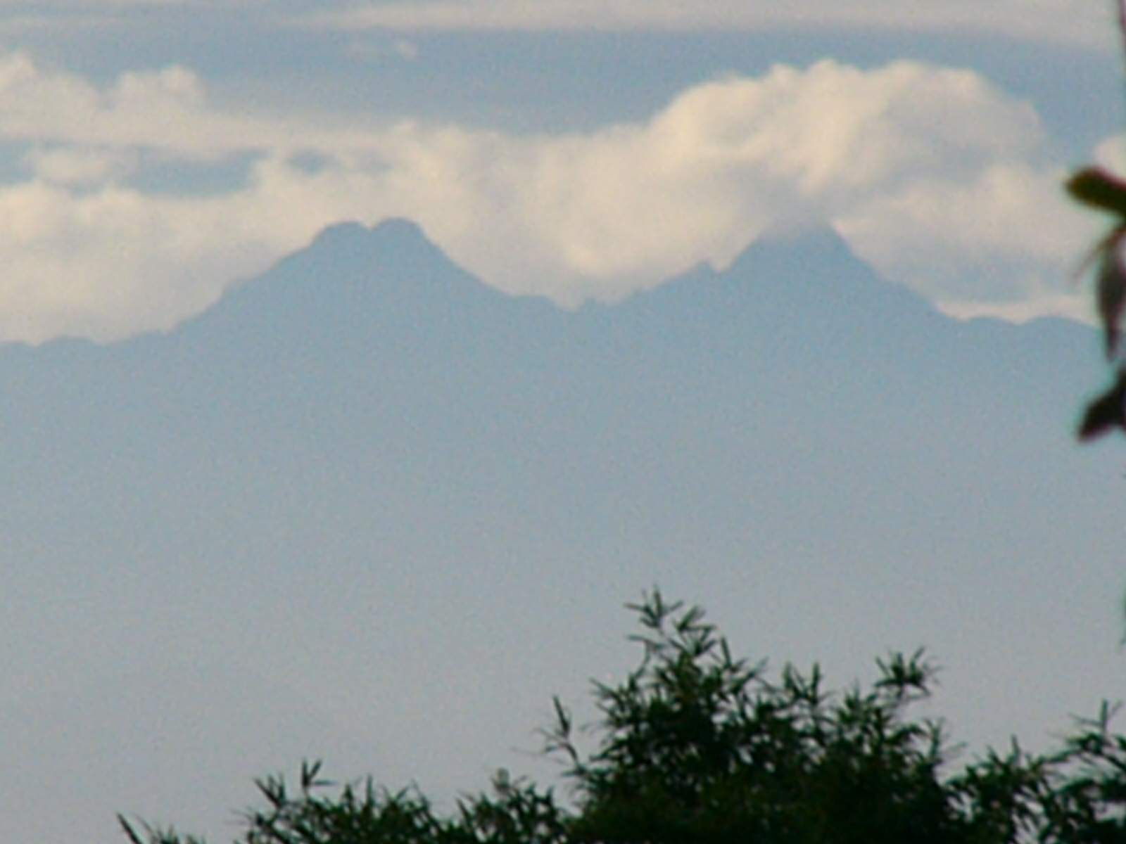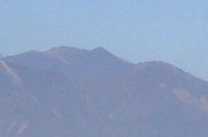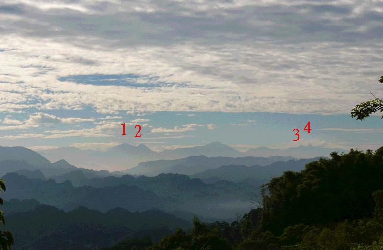 其實是我應該感謝scania(吹雪丸)兄才對! 因為三汀山曾經是我一家四口登高的好去處, 可是從來沒注意到遠方的山頭. 事實上, 是 scania (吹雪丸)兄啟發了我對這些遠方山頭的興趣呢! 最後我還有一點小疑問, 就是您認為是鳶嘴山的山頭, 我看起來倒覺得像是大雪山(H 3530m, 距離三汀山 43.0k), 而鳶嘴山(H 2130m, 距離三汀山 23.4k) 應該在更右邊一點. 從三汀山附近看此兩座山, 因為距離不等的關係, 兩者看起來幾乎是一樣高的. 但仔細觀察您所附的照片, 似乎可發現您所謂的那座 "鳶嘴山" 好像比小雪山(H 2997m, 距離三汀山 33.9k)要遠. 另外, 三汀山、鳶嘴山與鞍馬山(H 2666m, 距離三汀山 30.2k)恰好在一直線上, 所以從三汀山往鳶嘴山望過去, 會看到鞍馬山, 因為鞍馬山看起來會比鳶嘴山高. 附上從東卯山拍到的大雪山照片, 很抱歉影像不太清析!
