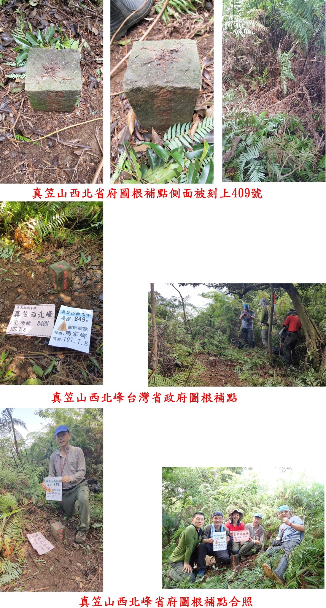 09:14△真笠山西北峰,高835公尺,台灣省政府圖根補點,側面被刻上409號;基石於最高點853山頭北面125公尺處,不在高點於路右靠崖邊處,無任何路條,找了一陣子方於芒萁中尋獲;山頂視野欠佳,僅西面可俯瞰內埔的田園聚落,獵徑續行應可通往真笠山2-1558,上山走1小時又54分鐘,比預期還花時間。