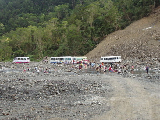 15:00收拾妥當回家囉!沿著河床便道,顛簸、涉溪緩慢前進,距加羅坂部落前約1公里路肩遇一對夫婦,互相扶持著女的已是精疲力盡、一跛一跛痛苦的行走,領隊阿鋒停車順戴一程,於車上閒聊中得知,當初他們的領隊與車行講好在加羅坂部落活動中心接駁,如要到吊橋接駁還要加600元,原來如此!不予置喙!辛苦啦!車經南迴公路到屏東接二高,在屏東交流道下吃晚餐,豬腳加餛飩犒賞自己今天的辛勞!22:30回到嘉義結束愉快的行程!