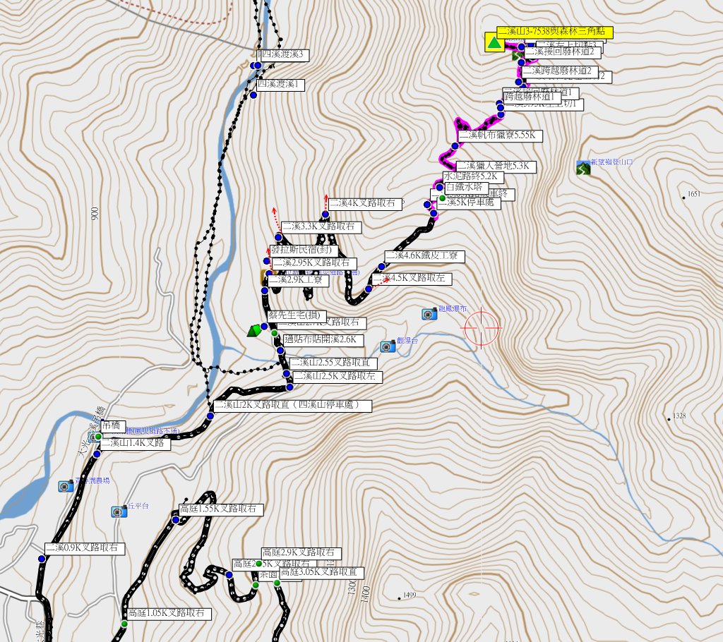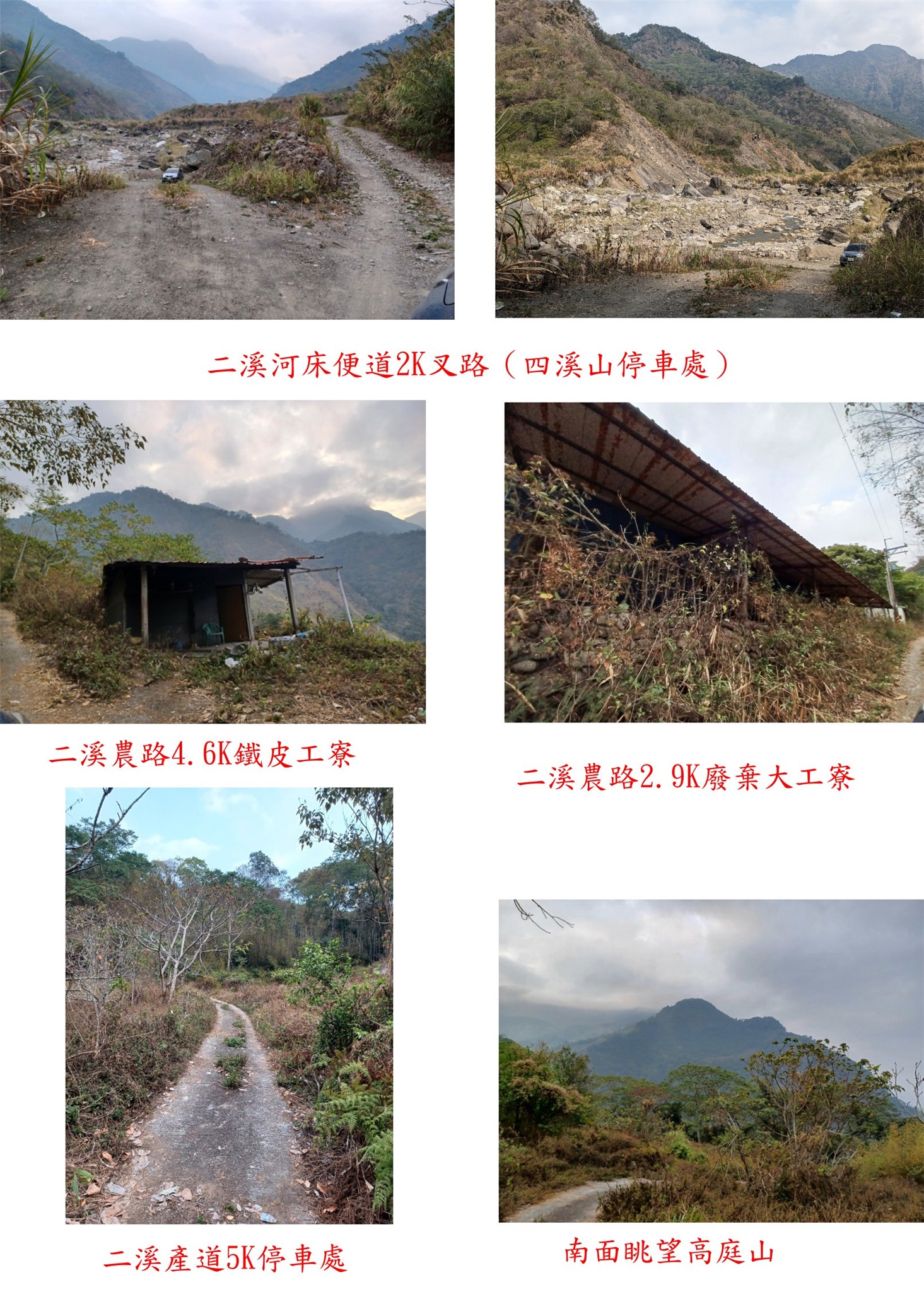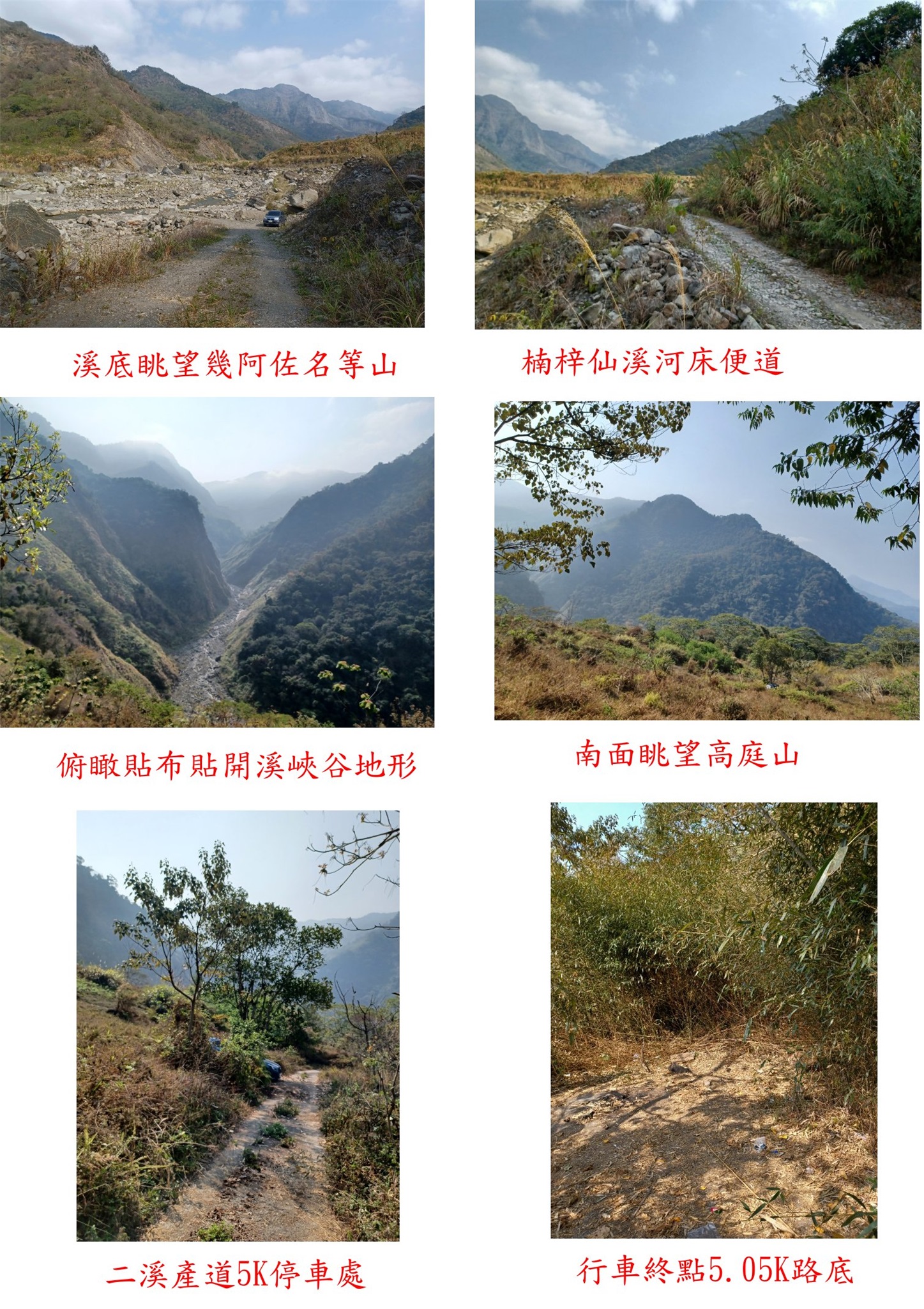 05:59由甲仙走台29線往北至那瑪夏聚落的台29線0K起點【0K】,右轉河階開墾地農路至0.9K叉路,取右前行至1.4K叉路,低底盤車輛建議停車處;取右進入路況差的楠梓仙溪河床便道至2K叉路,左下河床隨即無路可溯溪往四溪山(四溪山停車處);取直便道至2.5K叉路,於此接到崩塌的舊路(取直的舊路已不通),取左溪底便道隨即至2.55K叉路,續取直於2.6K處過水量很小的貼布貼開溪;前行離開河床轉為水泥路至2.7K叉路,左往已廢棄的蔡先生農宅不取,產道至2.9K經廢棄大工寮;續行至2.95K叉路,左往廢棄的發拉斯民宿不取,取右至4K叉路,續取右至4.5K叉路;取左經4.6K鐵皮工寮,續行水泥農路,沿途俯瞰貼布貼開溪峽谷地形。