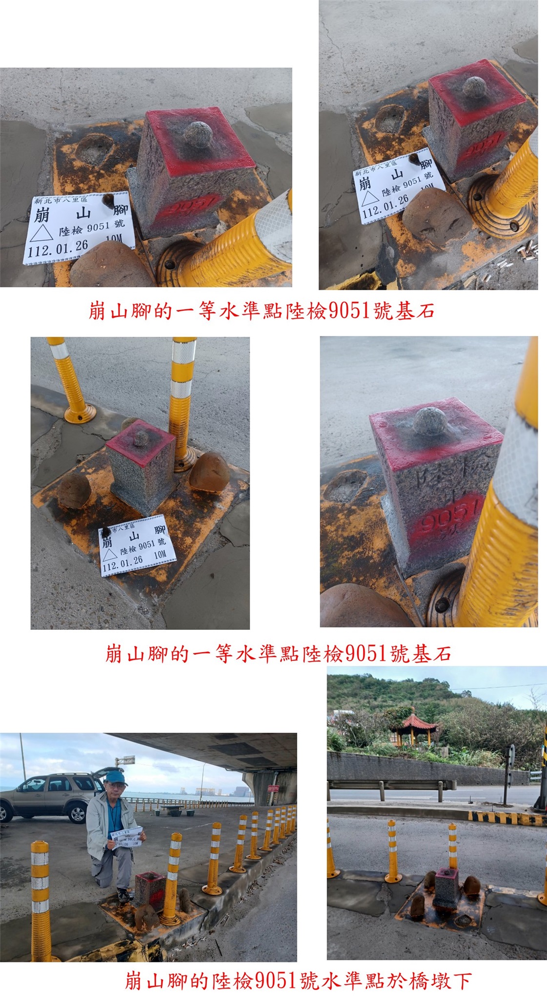 崩山腳的一等水準點陸檢9051號基石,位於台15線(15.25K處)與北79線叉路口【高架的快速道路台61號】,靠近瑞平國小;於台61線橋下編號「PB6」的橋墩旁找到基石,聯勤測量隊設立於民國90年5月,台東阿倫用GOOGLE街景就能找出有夠厲害。