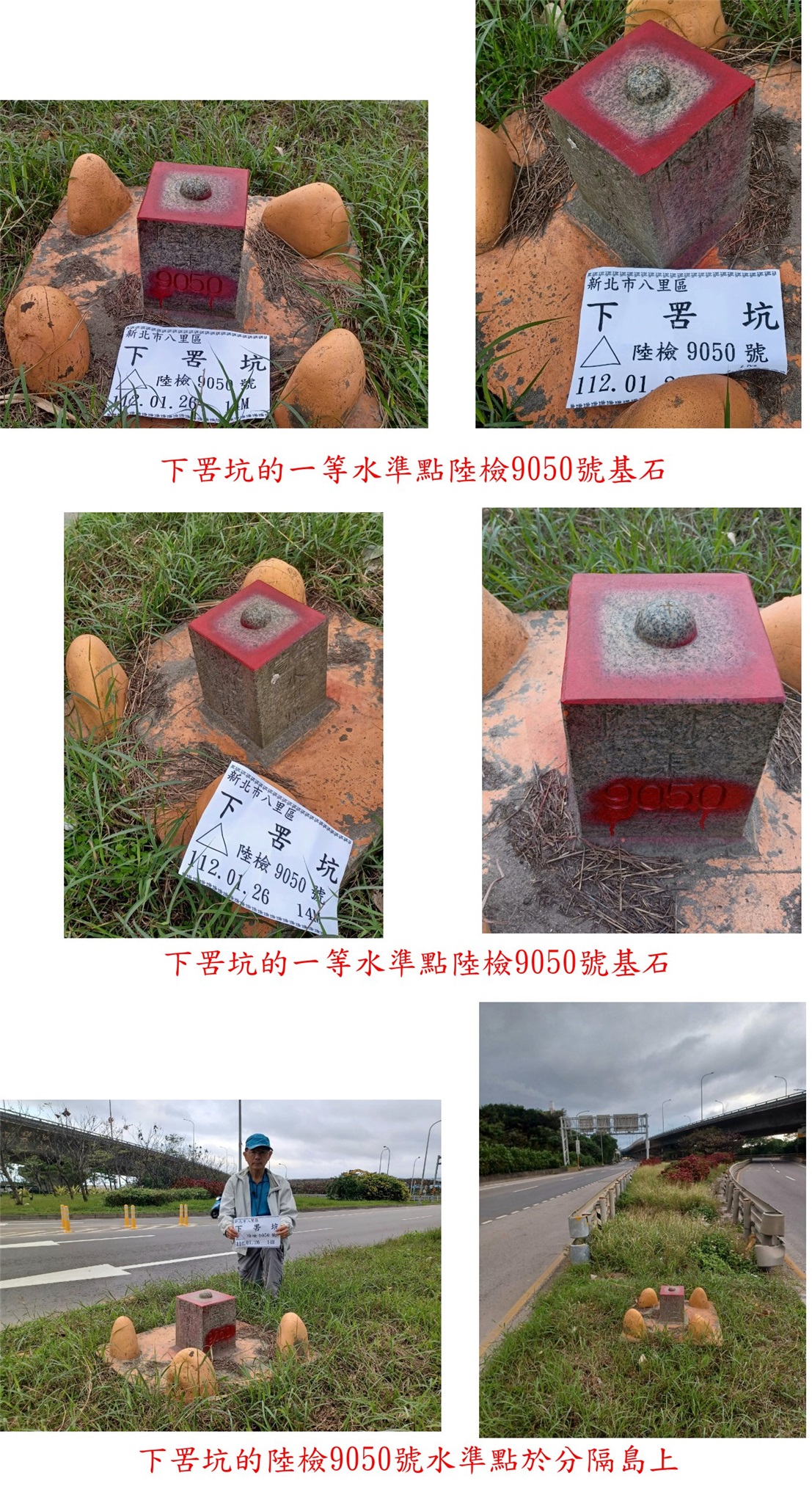 2、下罟坑:位於新北市八里區,標高14公尺,一等水準點陸檢9050號基石;座標287050 2781402。