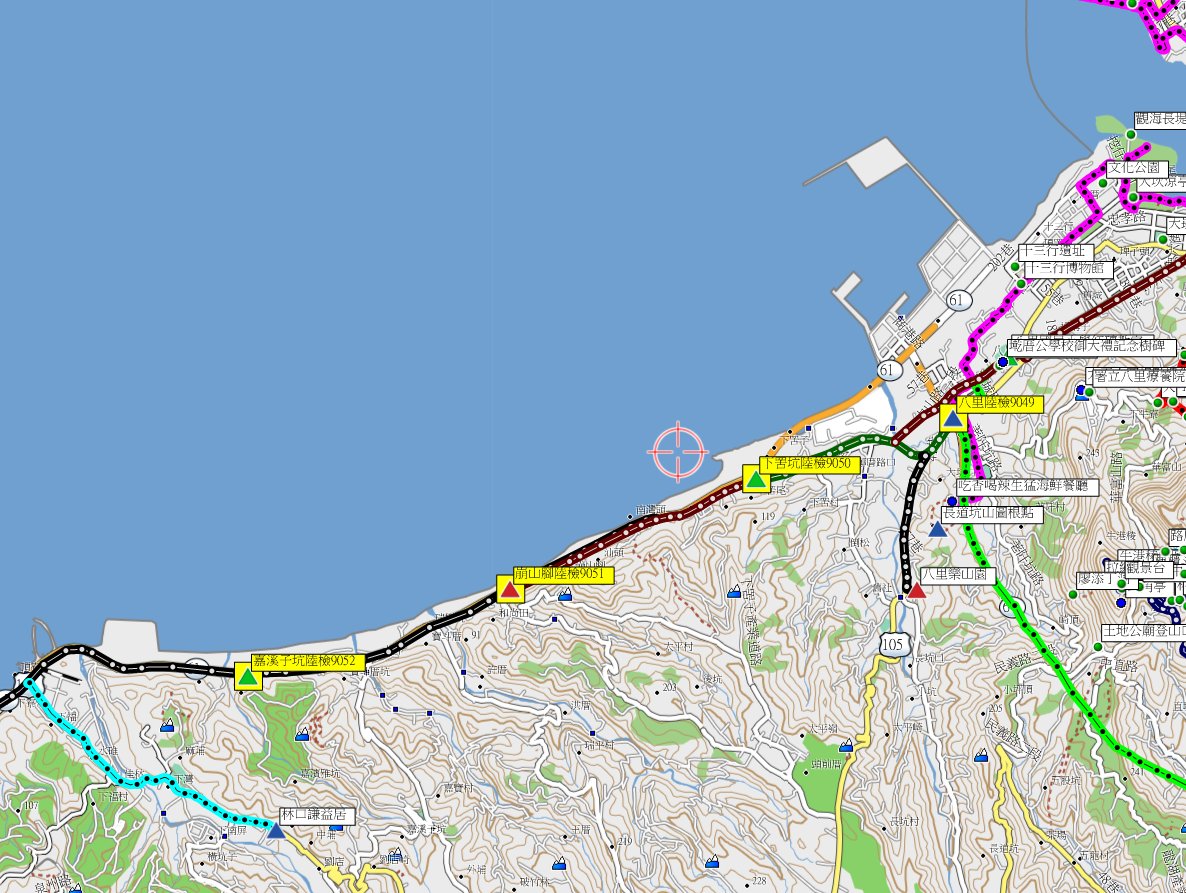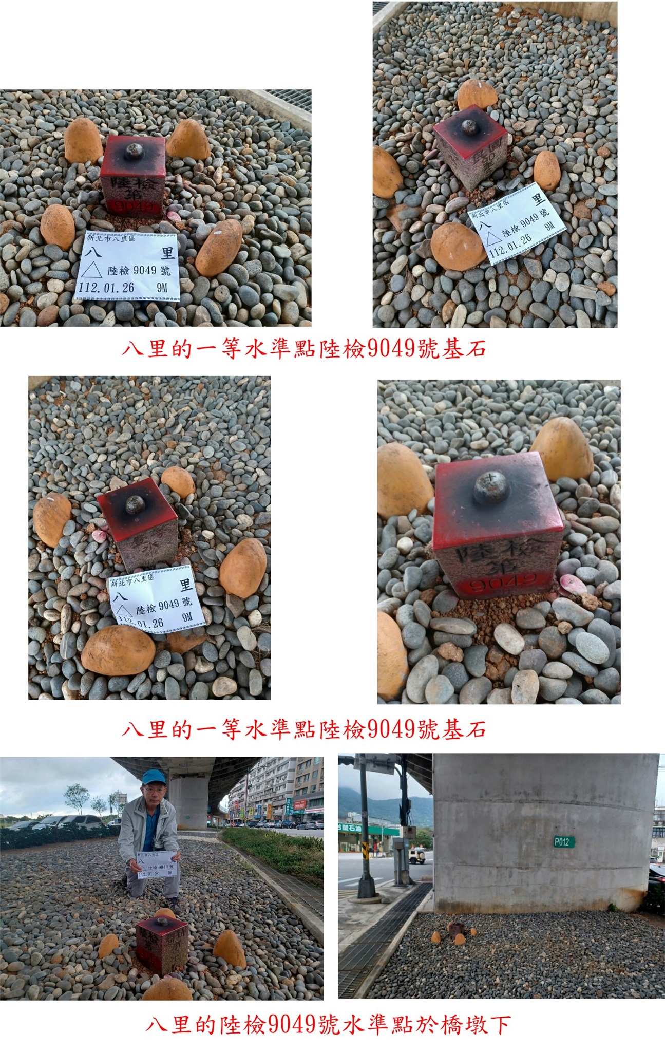 3、八里:位於新北市八里區,標高9公尺,一等水準點陸檢9049號基石;座標289225 2782014。