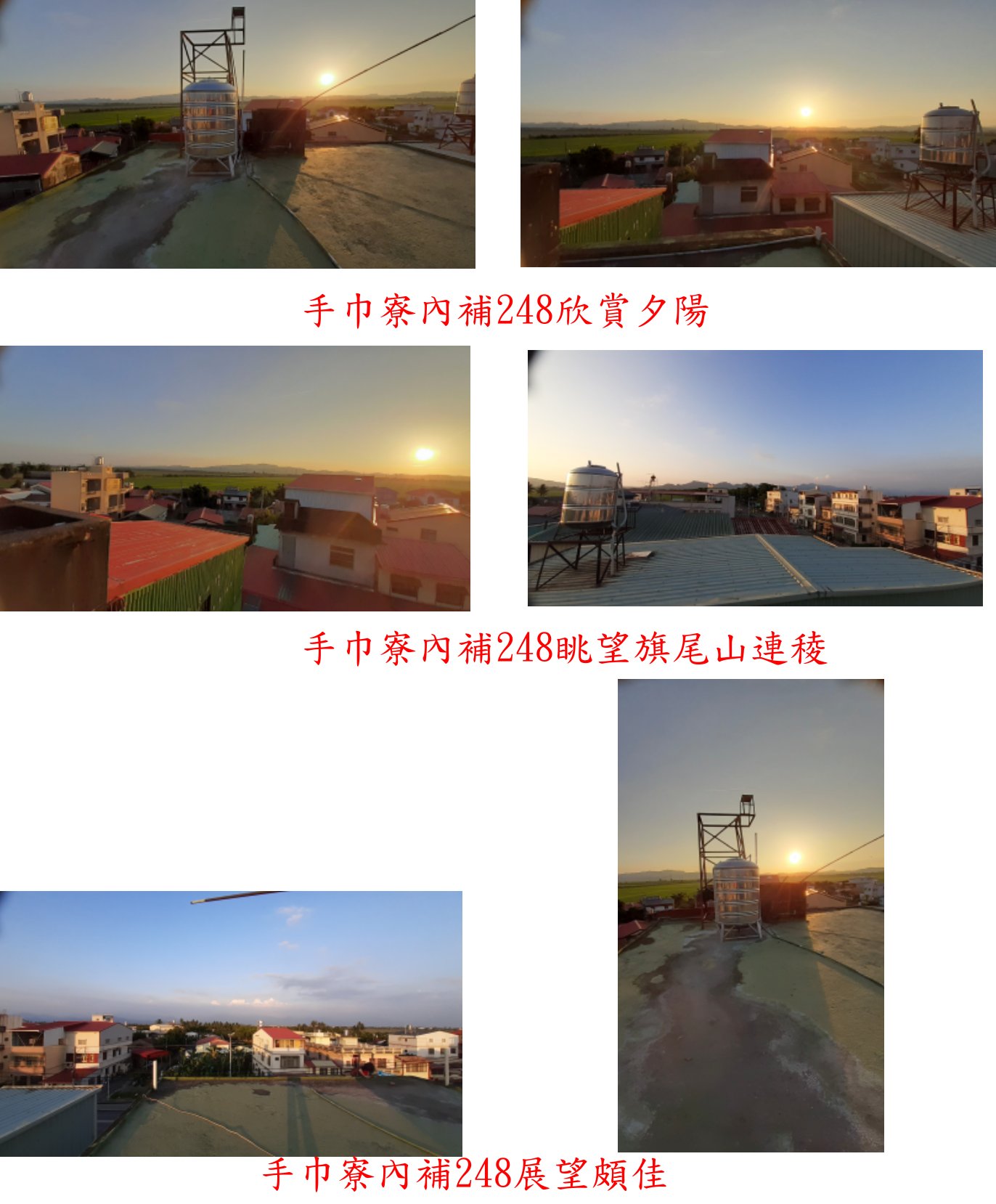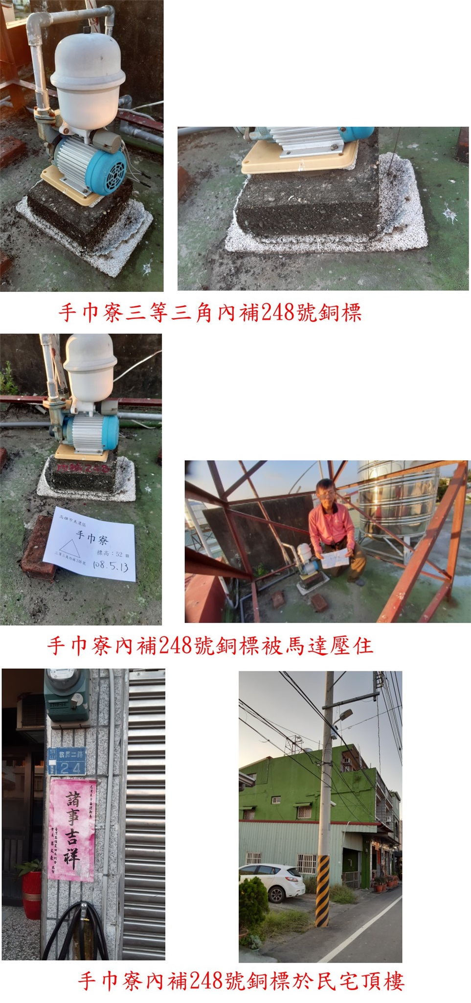 剛好問到陳姓屋主經同意後由家人帶領至3樓,由鐵梯爬上屋頂,於水塔旁見到手巾寮三等三角內補248號;銅標於水泥基座上,但被抽水馬達蓋住只能看到銅標的角落,屋頂展望不錯,此戶人家很客氣。