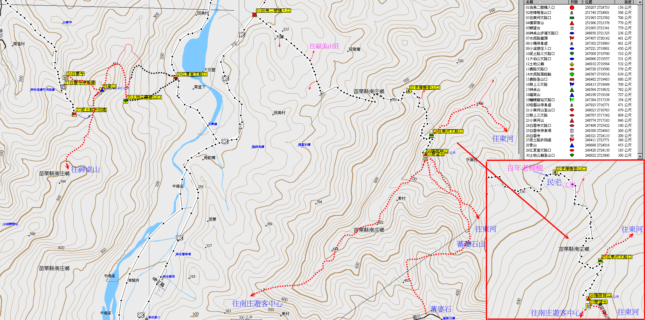 3、小東河山-位於苗栗縣南庄鄉,標高846公尺,三等三角點4193號基石,GPS(248774 2717183)。此山登山口有二處,分別於124縣道「福南」與「鱸鰻窟」站進入。