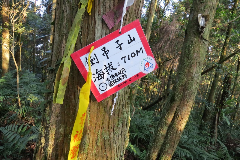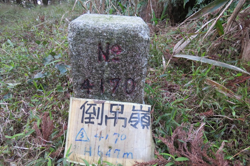 倒吊子山(0811)左行不久到最高點,倒吊子基點並不在此處,續行下坡約1分鐘倒吊子山基點出現,有山名牌高度則有710與747兩個版本,但看地圖與GPS,應該是747M比較接近實際狀況。