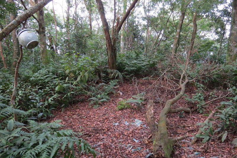 茶壼營地(1202)有一處不明顯的舊營地,地有上破碎帆布,還有一只茶壼懸掛。續行山徑依然不佳,偶有稜線路路況則略佳,進入谷地又陷入荊棘中。