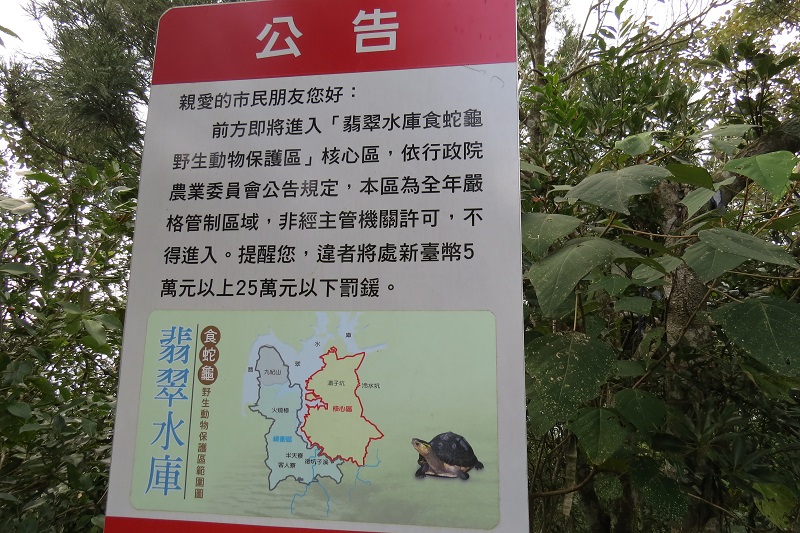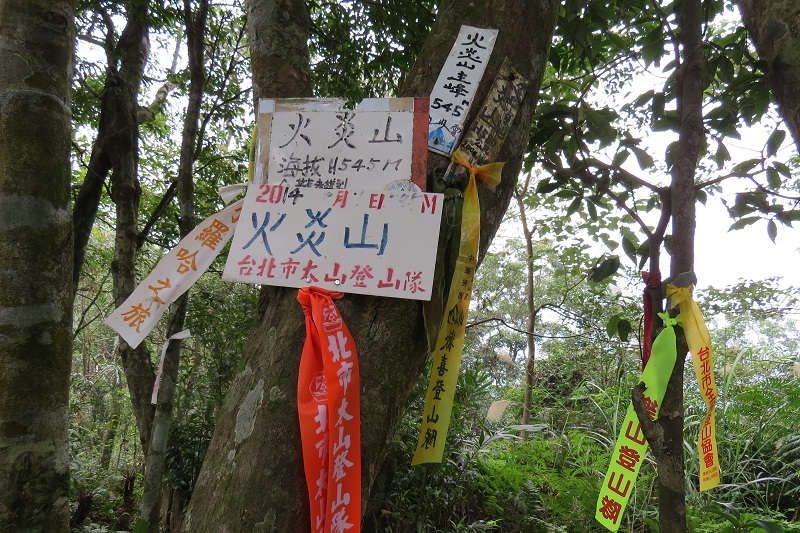芋園尖(1120)看到遠方大山頭距離還不近,努力攀爬終於來到芋園尖,山頂只有三等點孤立沒有山名標示,有翡翠水庫的食蛇龜保護區牌,原來有新山徑可通翡翠水庫畔。小休後續行,竟完全看不到往火炎山的山徑,這就是此行最差的山徑,果然連路徑都沒有,拿出GPS,撥開密蕨類果然出現除舊路條與不明顯山徑。接下來往火炎山的路徑是又一山又一谷,路徑不明、路條少又陳舊、黃藤有刺植物當道,路徑較差處要拿GPS朝概略方向前進,幾處黃藤濃密處衣服、背包、頭巾全中倒勾進退不得…。