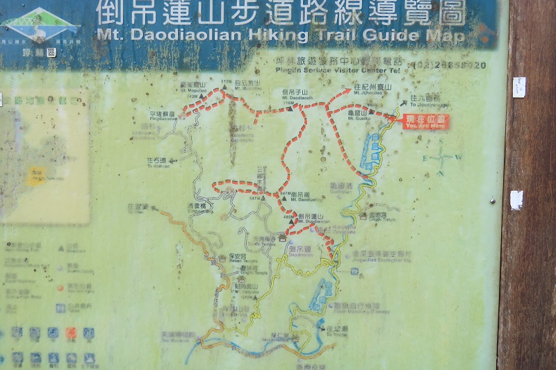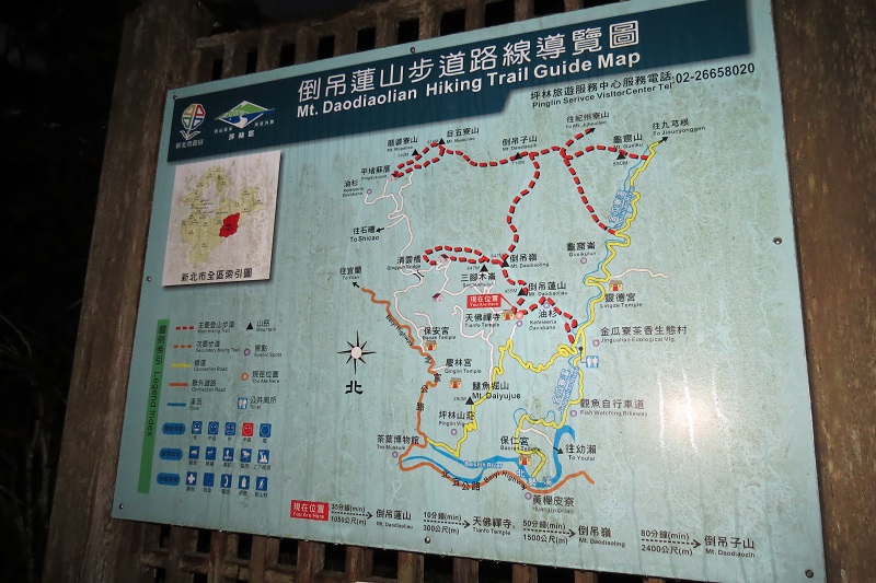 倒吊蓮登山口(0617)三峽開車直趨坪林,續往宜蘭方向約600M由協德宮牌坊右下,過大林橋循天佛禪寺或倒吊蓮山指標前進,約4K來到路底農家,立有倒吊蓮山登山路線圖,有寬路面約可停2部車,此地H430M左右。