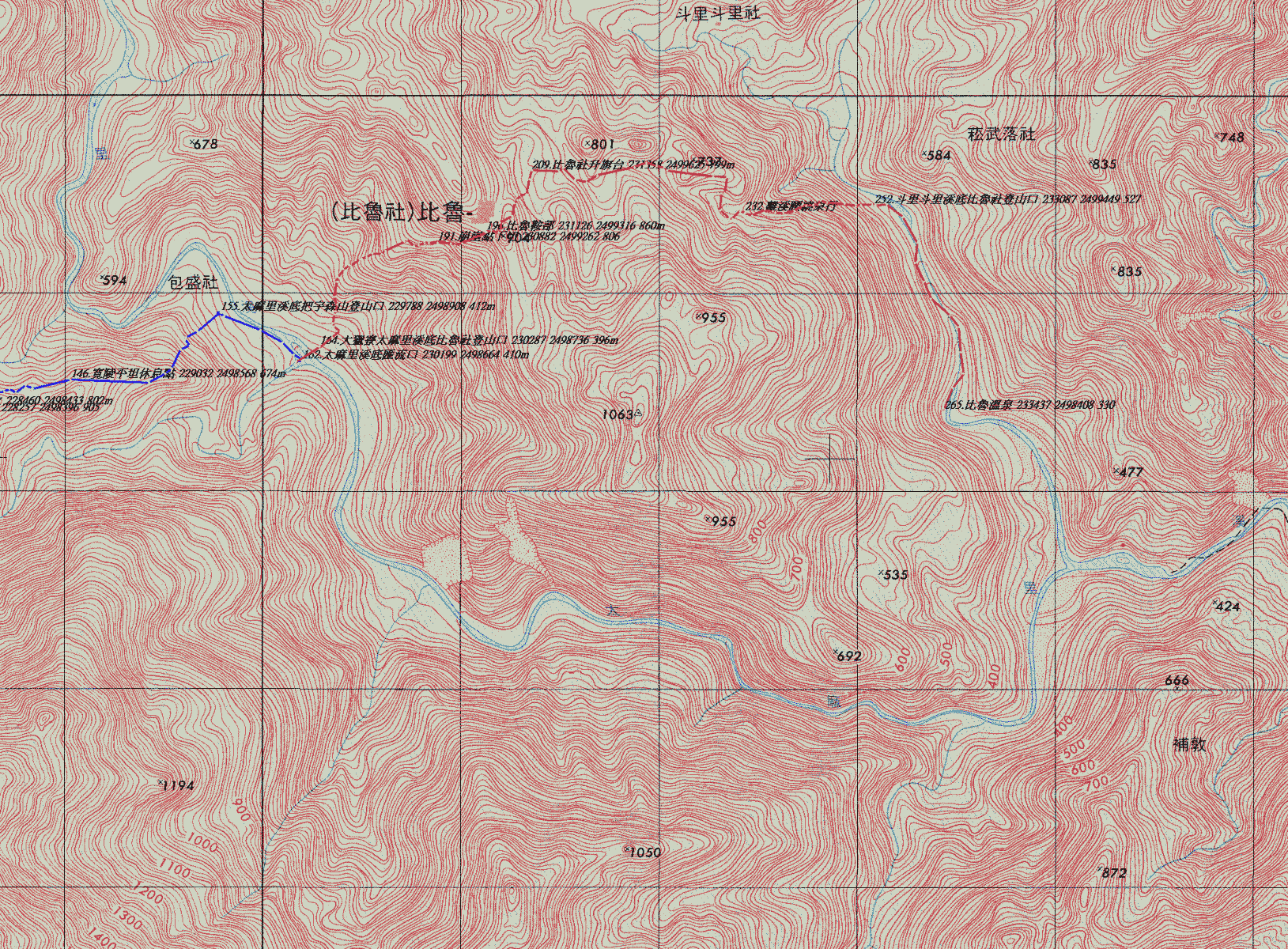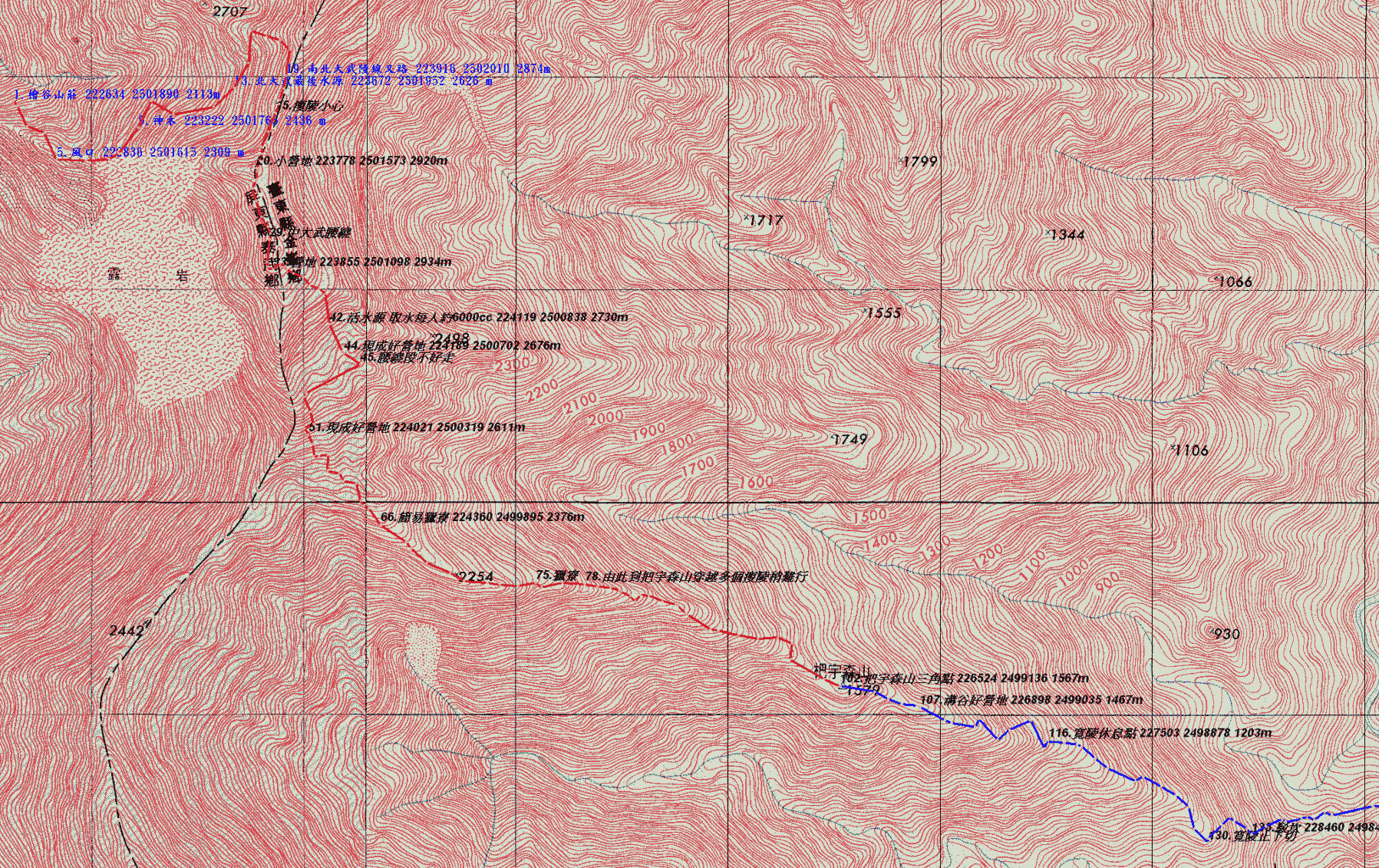 北大武越嶺下把宇森出比魯, 四天的過程中幾乎是不斷的爬升或下降或找路跡布條.看地圖定位或重新開路與黃藤奮戰,真正感受到所謂的探勘苦與樂。感謝團隊的合作與老天爺幫忙的好天氣,此行真永生難忘。個人自認記錄寫的不很完美,僅以簡述及走過的行跡圖獻給曾經共甘苦過的好伙伴,雖然我們一行人(1女6男)年輕已不再,但對山的摯愛仍不改變….。