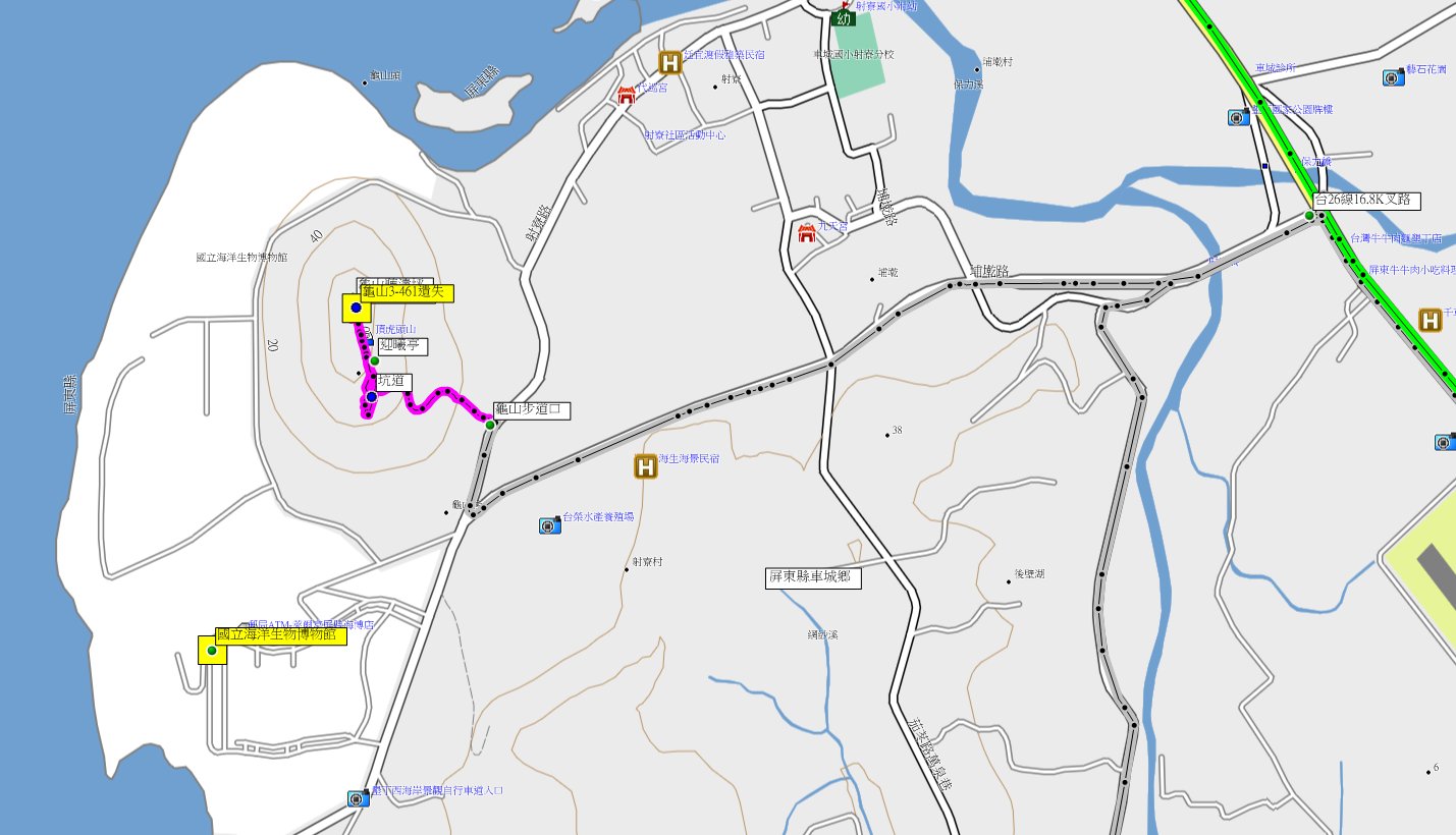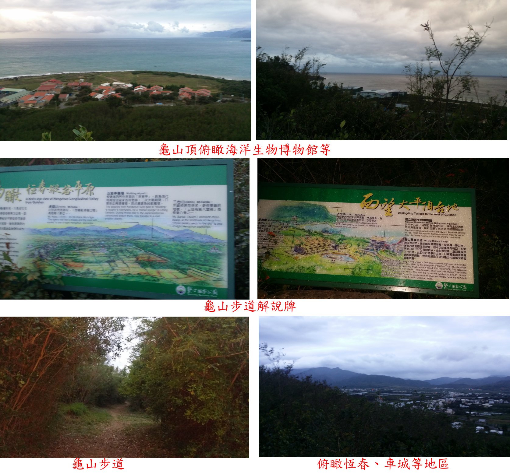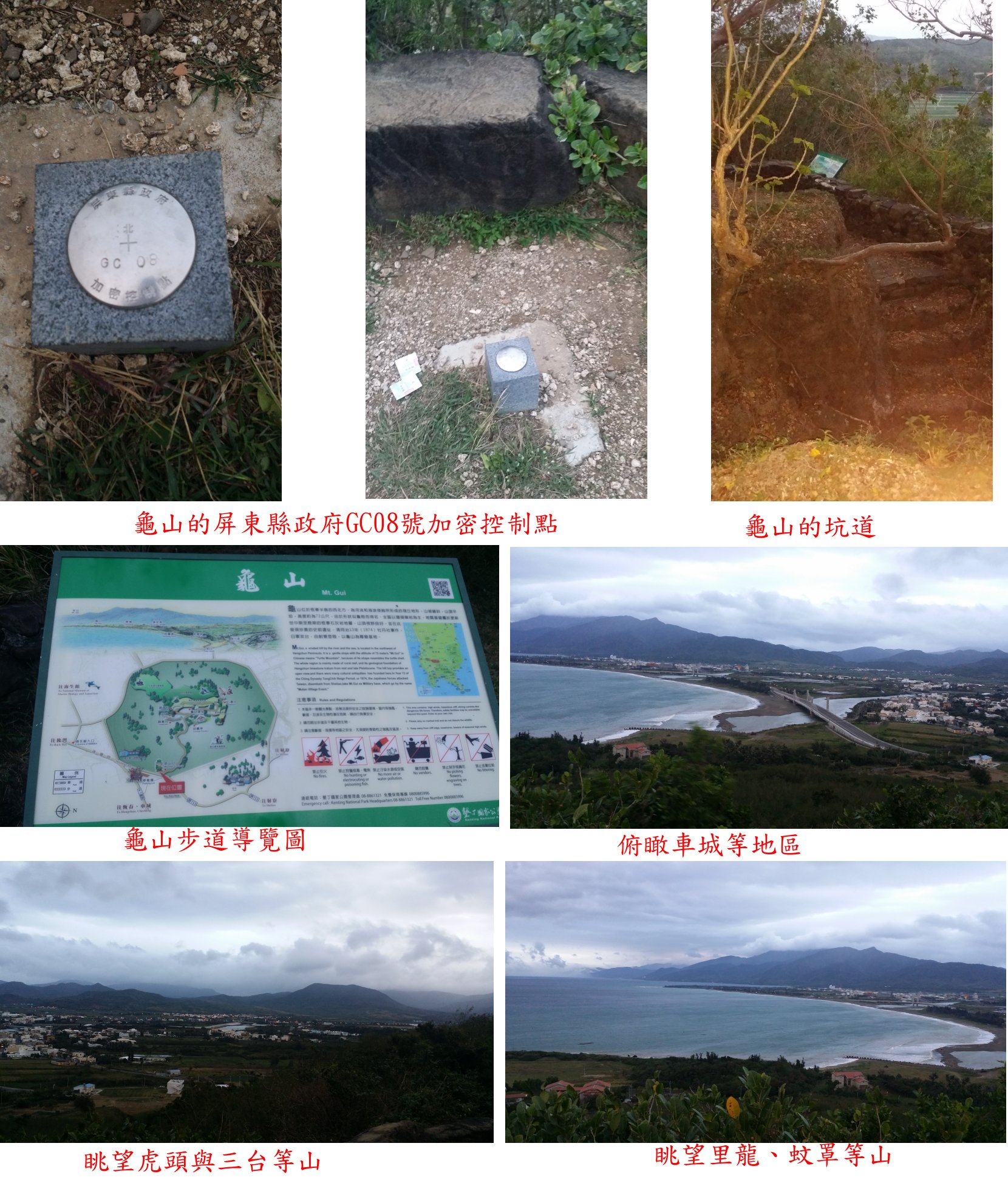 ◎墾丁三日遊第一天下午參觀海生館後至龜山觀日落,木階梯的龜山步道走7分鐘步道叉路,左往坑道先不取;步道續走20餘公尺左往第二觀景台亦不取,續直行走20餘公尺至迎曦亭,視野佳,俯瞰車城等地區;續前行走60餘公只抵達龜山頂,步道底即聽濤坪,3-461原點與石柱68均找不到,只見到GC08控制點;俯瞰恆春、車城、四重溪出海口與台灣海峽,眺望里龍、蚊罩、虎頭與三台等山,龜山也是觀日落私密的最佳位置,可惜今日天候欠佳;左亦有步道可環繞,原路回順道繞經第二觀景台與坑道;龜山步道上山走16分鐘,往返費時38分鐘。