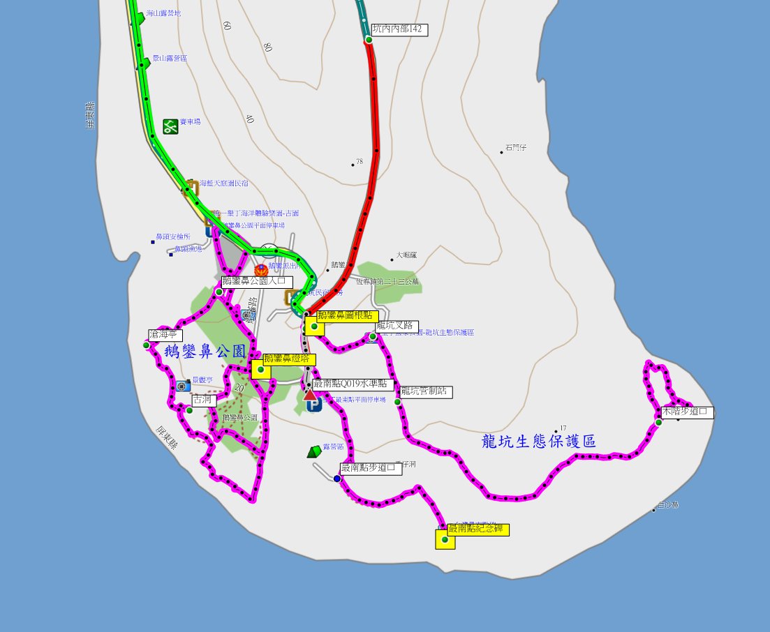 台北->高速公路->林邊【大福樂午餐】->海洋生物博物館->龜山步道【觀日落】->墾丁警光山莊(旅南餐廳晚餐、墾丁大街夜遊、夜宿)