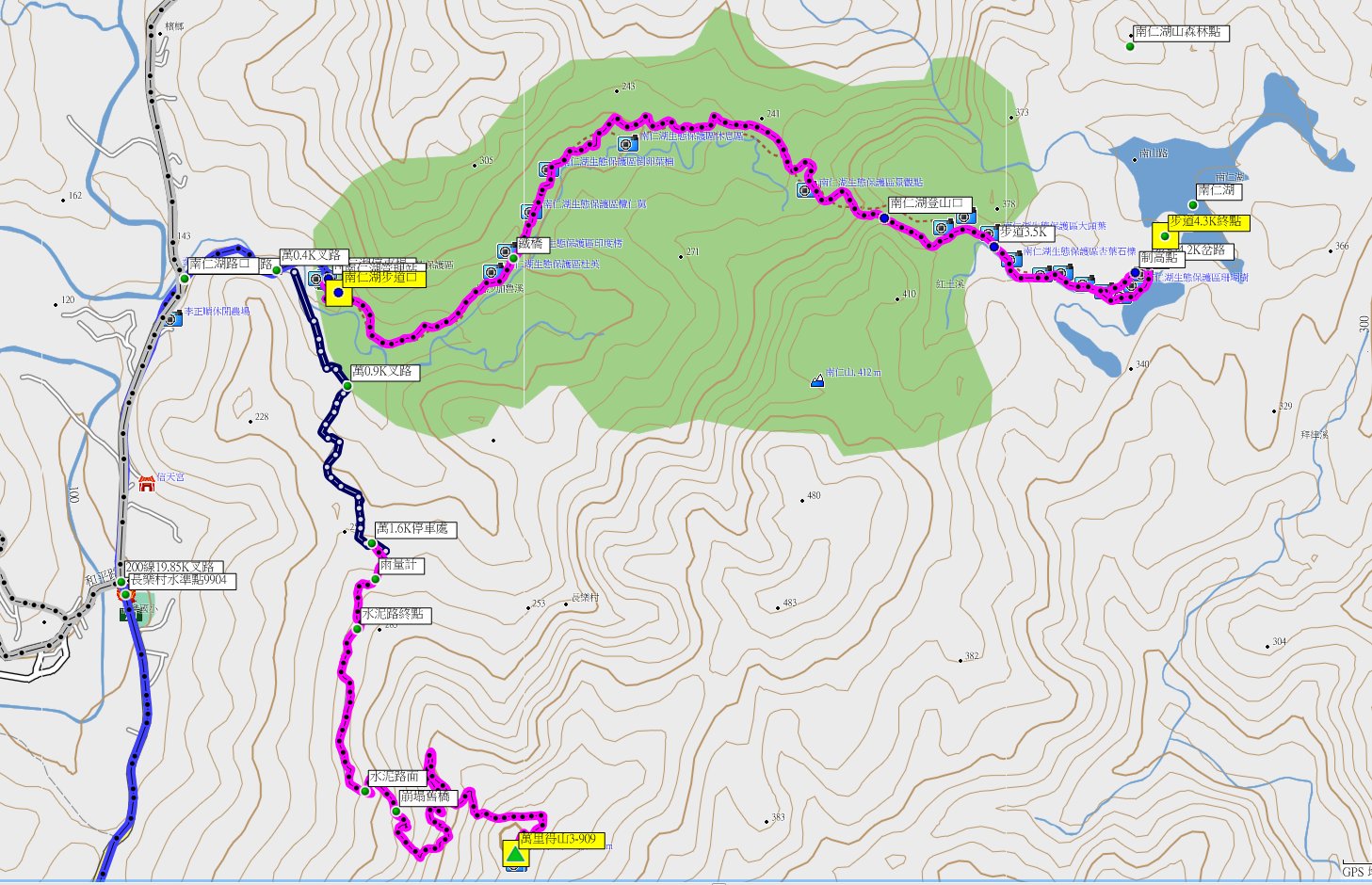 ◎此行先到南仁湖管制站聽生態解說,下雨穿戴雨具出發,步道為舊時土石路整修而成,沿溪谷修建每0.5K有標示牌,步道平緩易行,沿途林相相當豐富;走72分鐘至步道約4K處叉路,取左先往制高點,可欣賞南仁湖全景,另有小徑可接步道4.2K處,超級寒流有夠冷且下雨無法久留;下雨濕滑原路回至叉路,取左至4.3K的步道終點,有木製的「南仁山」看板,此為前國家公園為七頂峰活動所設立的,真正的南仁山(森林點)並不在此處,去程走1小時又37分鐘;於此原路折返,回程走61分鐘,此行往返費時2小時又33分鐘。