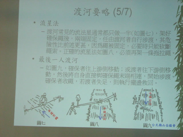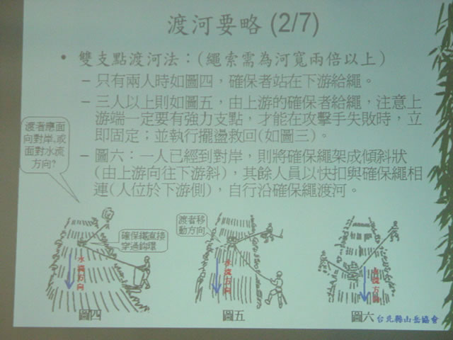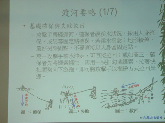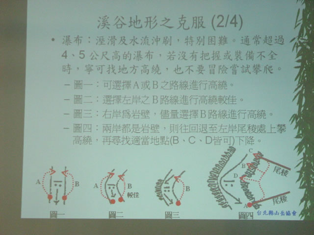 (二)溪谷地形之克服:常見的困難地形有深潭、瀑布、急流。