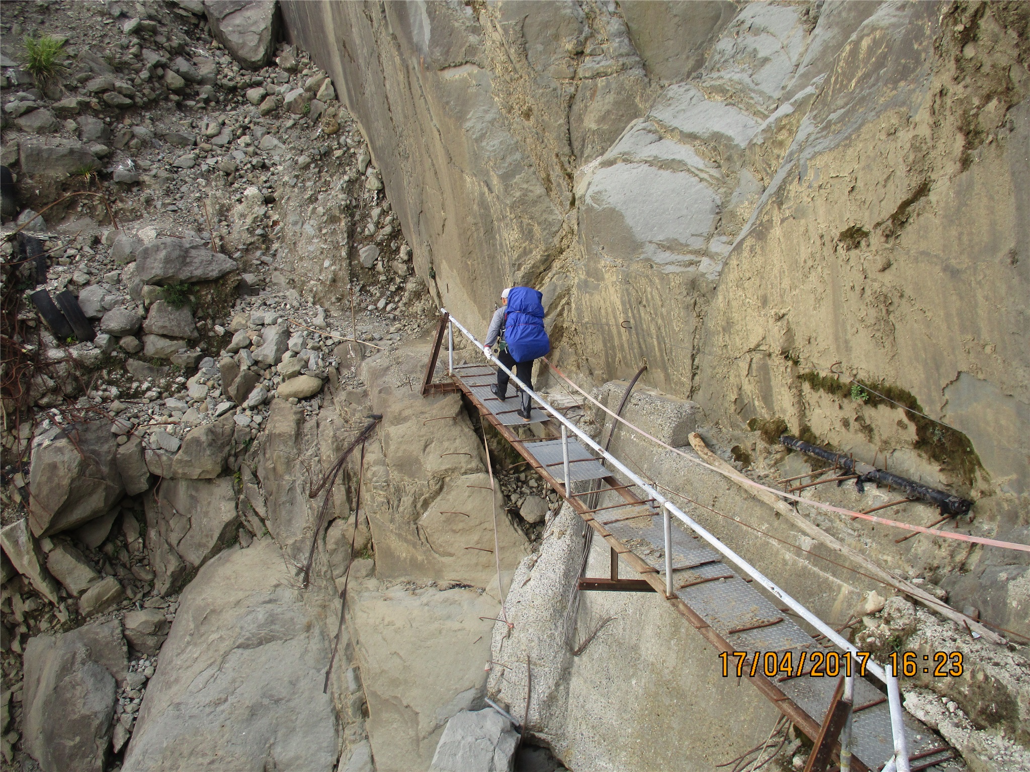 16:23~16:26過簡易『小鐵板』便橋。左側有扶手,右側綁有繩索,皆不堅固。在對岸的第三、第四片鐵板電焊處已經脫落,其中一片已經掉落下方,另一片踩在上面會滑動,甚為危險,需小心通過