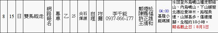 行程規劃:8/15早上6:00起登下午4點結束。