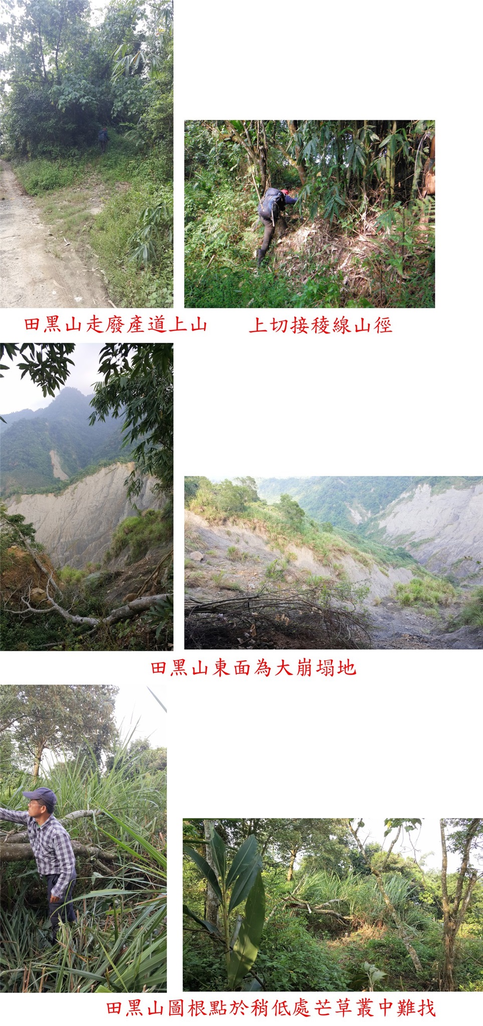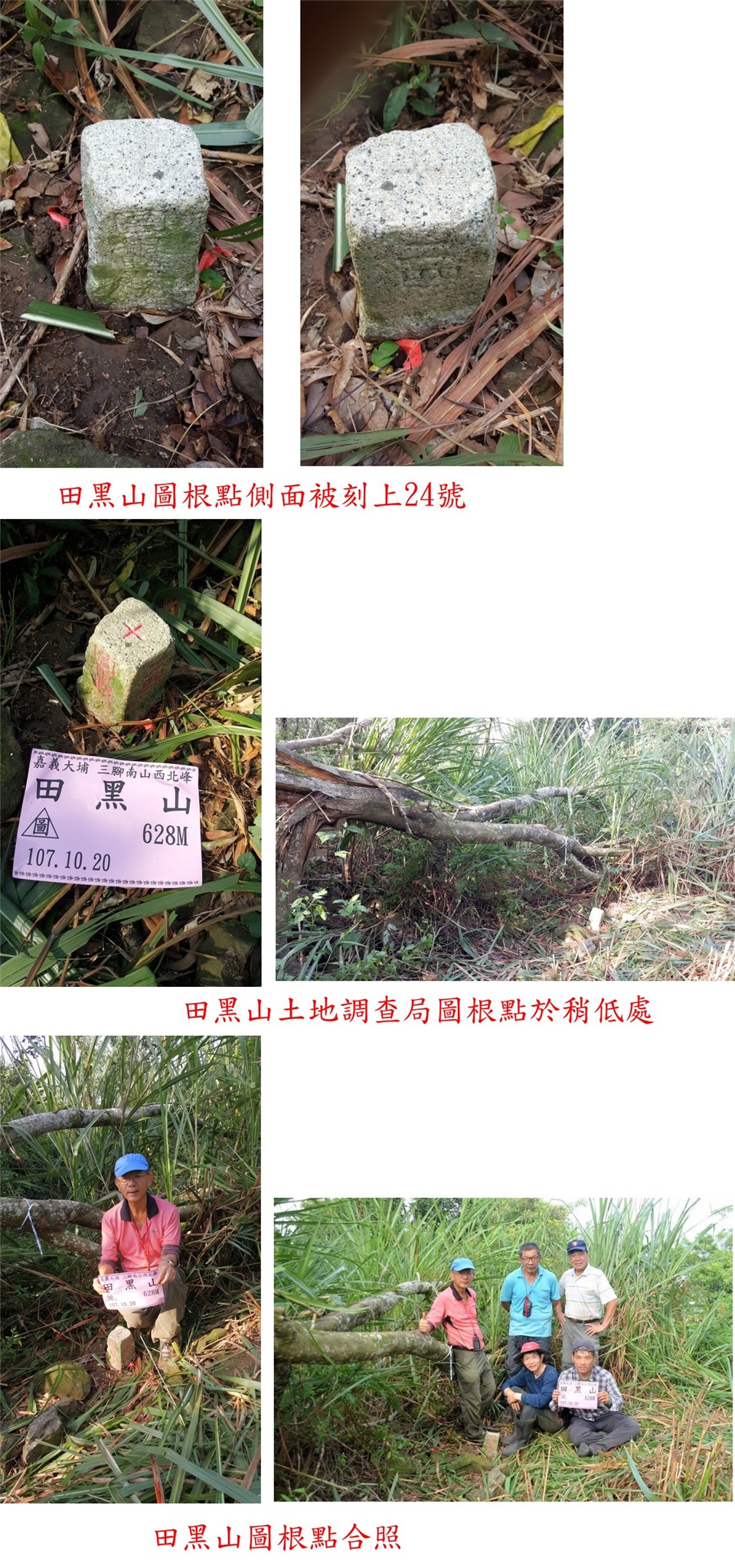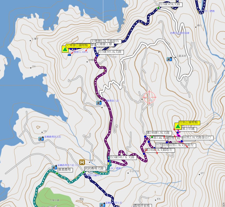 6、田黑山:又稱三腳南山西北峰,位於嘉義縣大埔鄉,標高628公尺,土地調查局圖根點;座標206463 2572701。