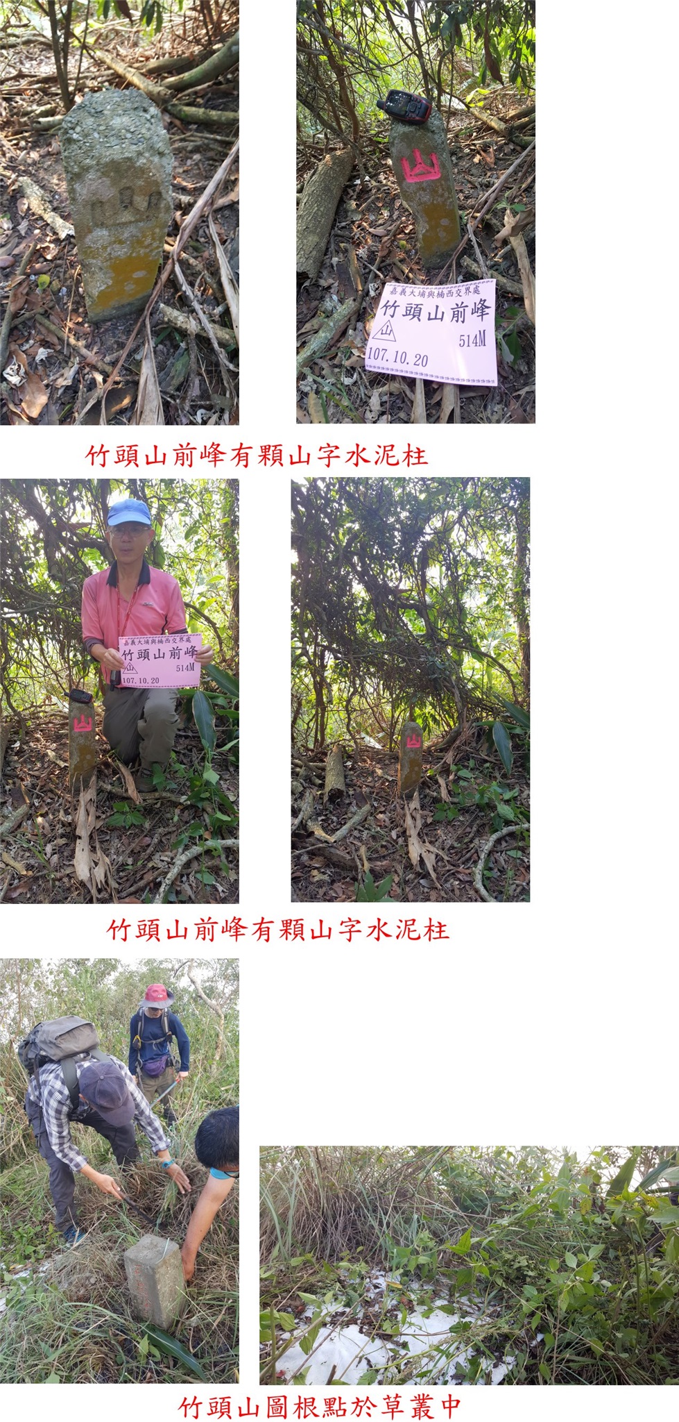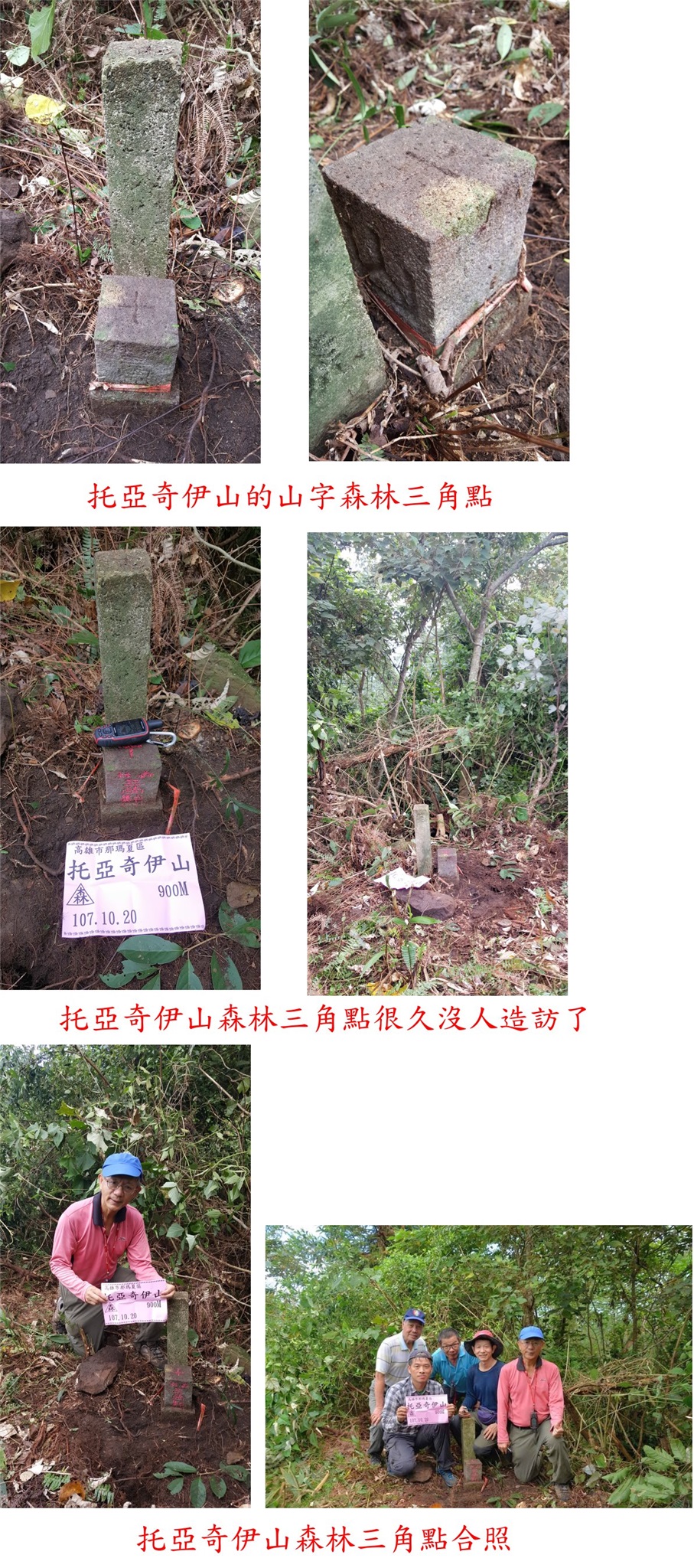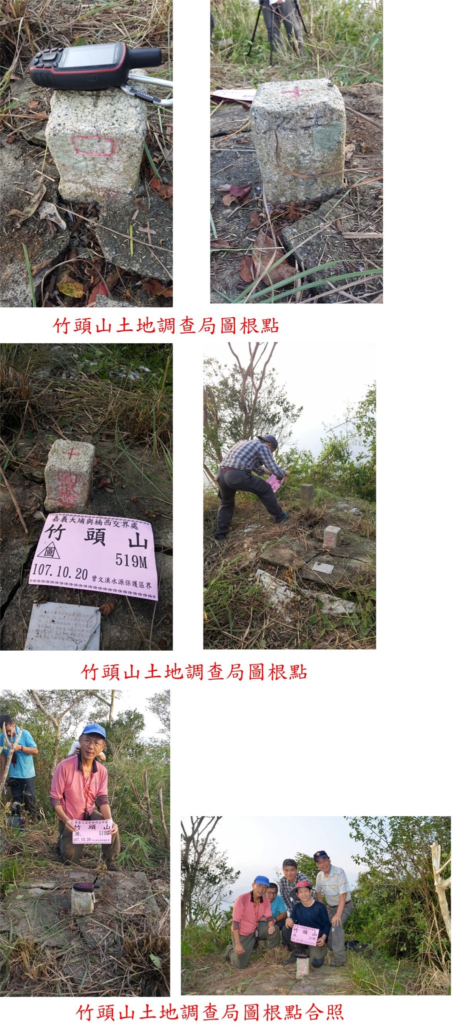 10/20約山友來嘉義與高雄交界的山區登山,第一座的托亞奇伊山森林點,此山應超過10年沒人造訪,走土石路上山,再接廢產道,上山走了50分鐘,山頂平坦基石很難找,花了10幾分鐘被校長於廢水池旁尋獲,森林點旁還有一保安林水泥柱,此山往返費時2小時又5分鐘;第二座為河表湖山3-5023,產道接近山頂只要3分鐘,大家陪王哥再來一次,第三座山為卓武山西北峰,上山走14分鐘,省府圖根補點旁還有大小2根保安林水泥柱,前3座山路程都很遠走完已接近中午;午餐後續走第四座的二寮坑山,自然石森林三角點於高點明顯好找,上山走23分鐘,比預期容易許多;第五座為火燒寮山圖根點,產道已接近山頂,只要3分鐘即可入袋,山頂視野佳,俯瞰下方的曾文水庫等;第六座山為田黑山圖根點,上山走22分鐘,基石不在高點躲在芒草叢中,旁為大崩塌地遲早會崩失;第七座為竹頭山圖根點,農路口鐵門上鎖只好踢上去,至工寮遇到農民,贈送我們好吃的楊桃,吃的很過癮,上山走45分鐘,圖根點旁很有顆曾文溪20號水源基石,山頂前另一山頭稱竹頭山前峰,另有顆山字水泥柱;提早收兵回至大埔市集夜宿。