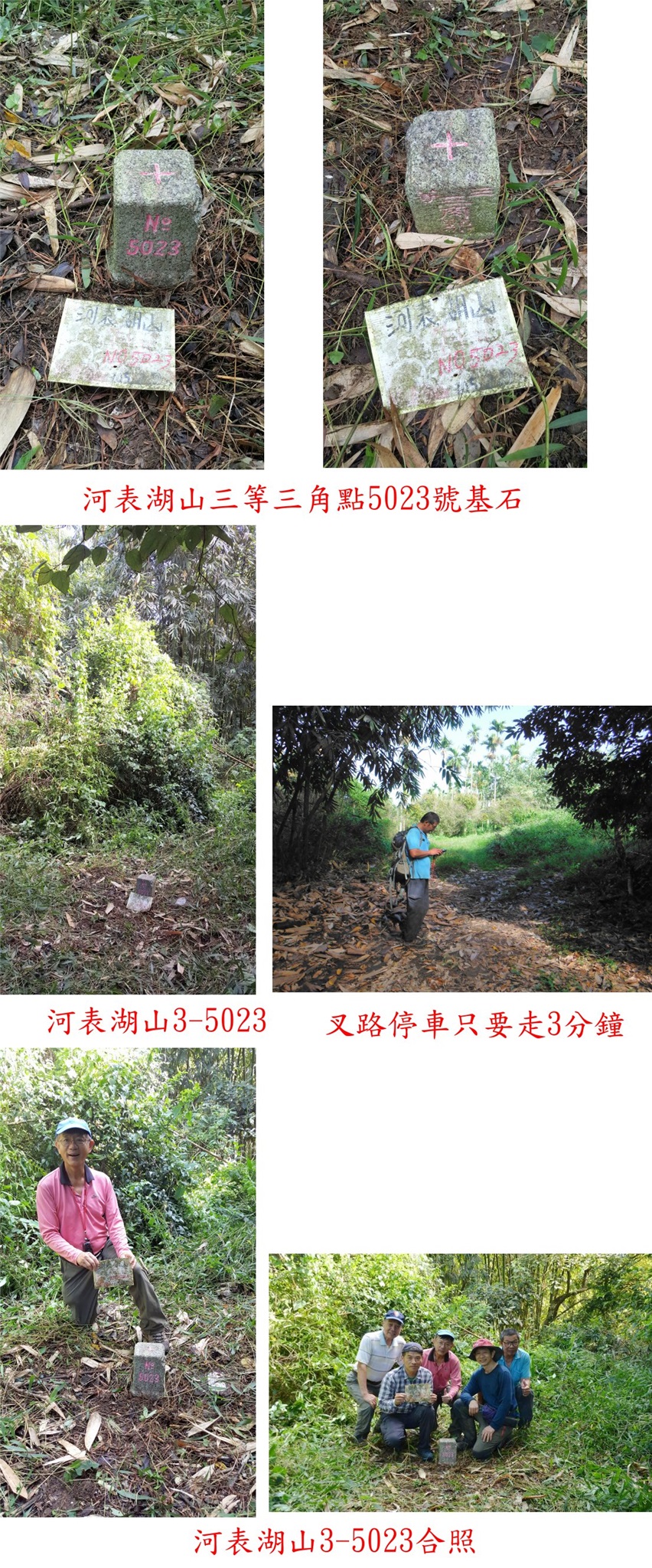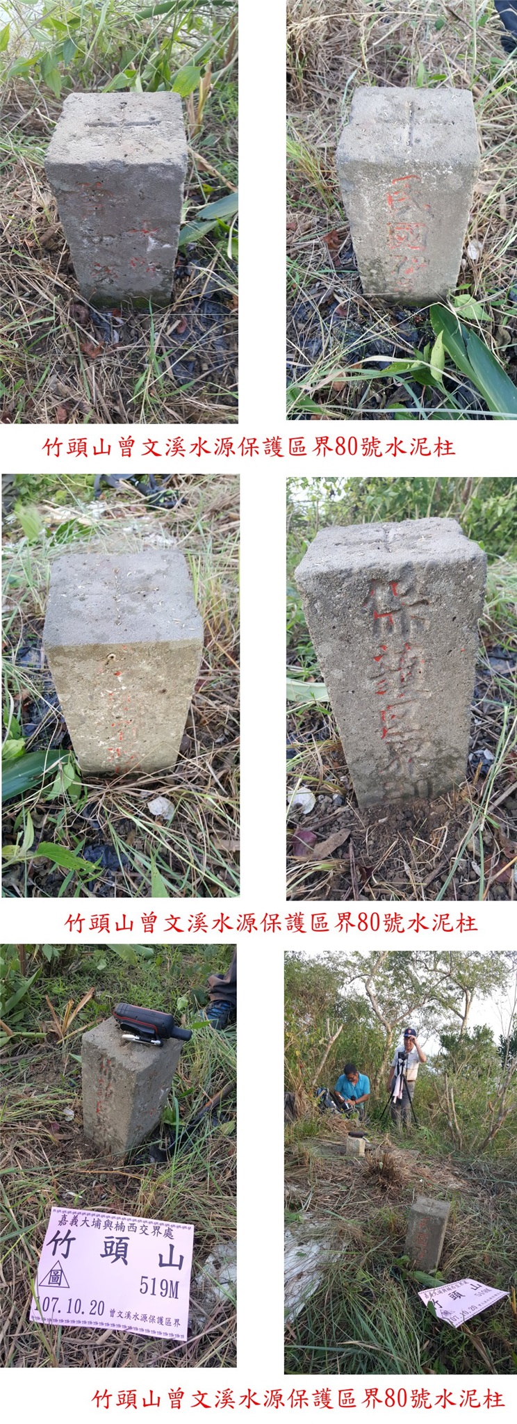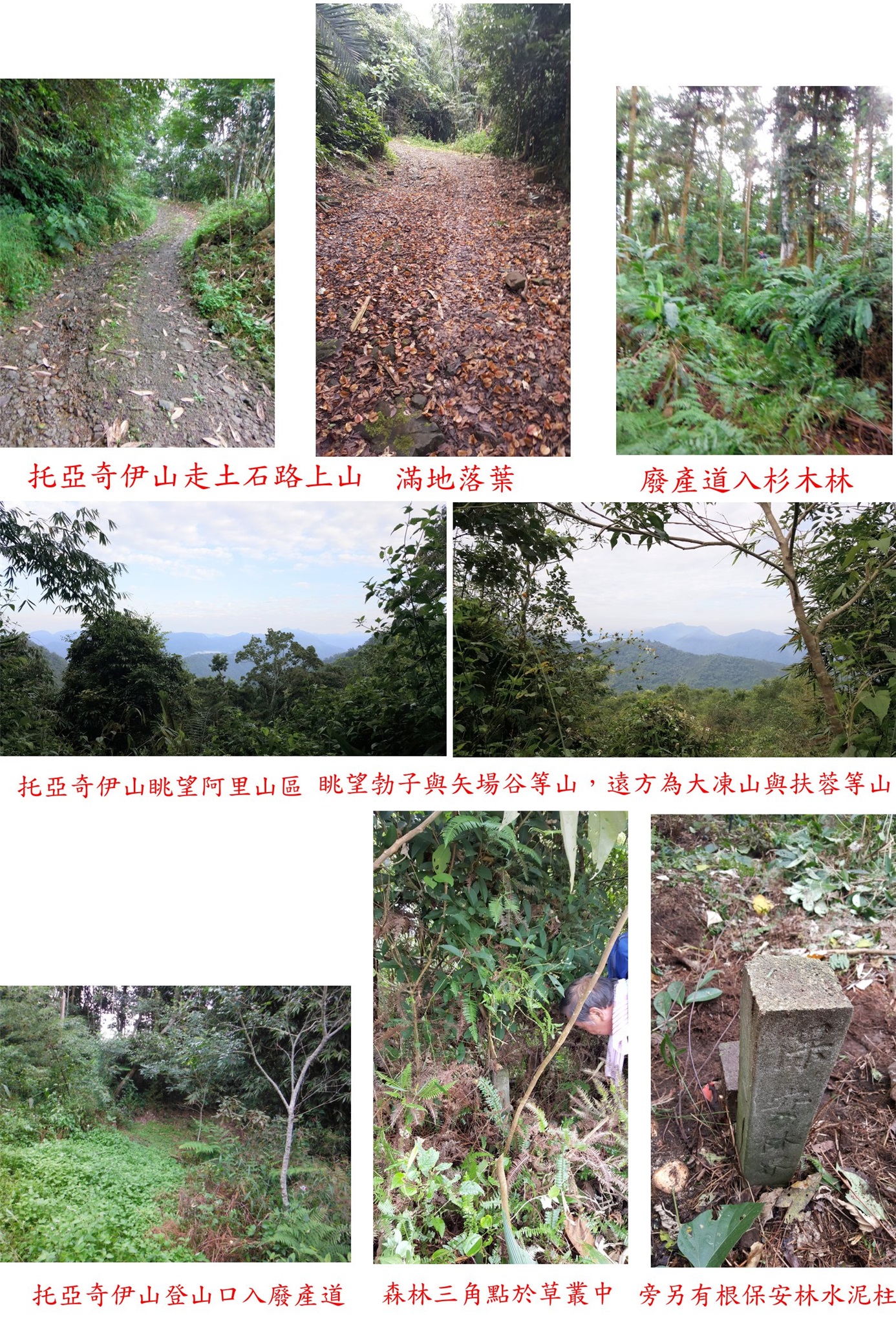 10/20約山友來嘉義與高雄交界的山區登山,第一座的托亞奇伊山森林點,此山應超過10年沒人造訪,走土石路上山,再接廢產道,上山走了50分鐘,山頂平坦基石很難找,花了10幾分鐘被校長於廢水池旁尋獲,森林點旁還有一保安林水泥柱,此山往返費時2小時又5分鐘;第二座為河表湖山3-5023,產道接近山頂只要3分鐘,大家陪王哥再來一次,第三座山為卓武山西北峰,上山走14分鐘,省府圖根補點旁還有大小2根保安林水泥柱,前3座山路程都很遠走完已接近中午;午餐後續走第四座的二寮坑山,自然石森林三角點於高點明顯好找,上山走23分鐘,比預期容易許多;第五座為火燒寮山圖根點,產道已接近山頂,只要3分鐘即可入袋,山頂視野佳,俯瞰下方的曾文水庫等;第六座山為田黑山圖根點,上山走22分鐘,基石不在高點躲在芒草叢中,旁為大崩塌地遲早會崩失;第七座為竹頭山圖根點,農路口鐵門上鎖只好踢上去,至工寮遇到農民,贈送我們好吃的楊桃,吃的很過癮,上山走45分鐘,圖根點旁很有顆曾文溪20號水源基石,山頂前另一山頭稱竹頭山前峰,另有顆山字水泥柱;提早收兵回至大埔市集夜宿。