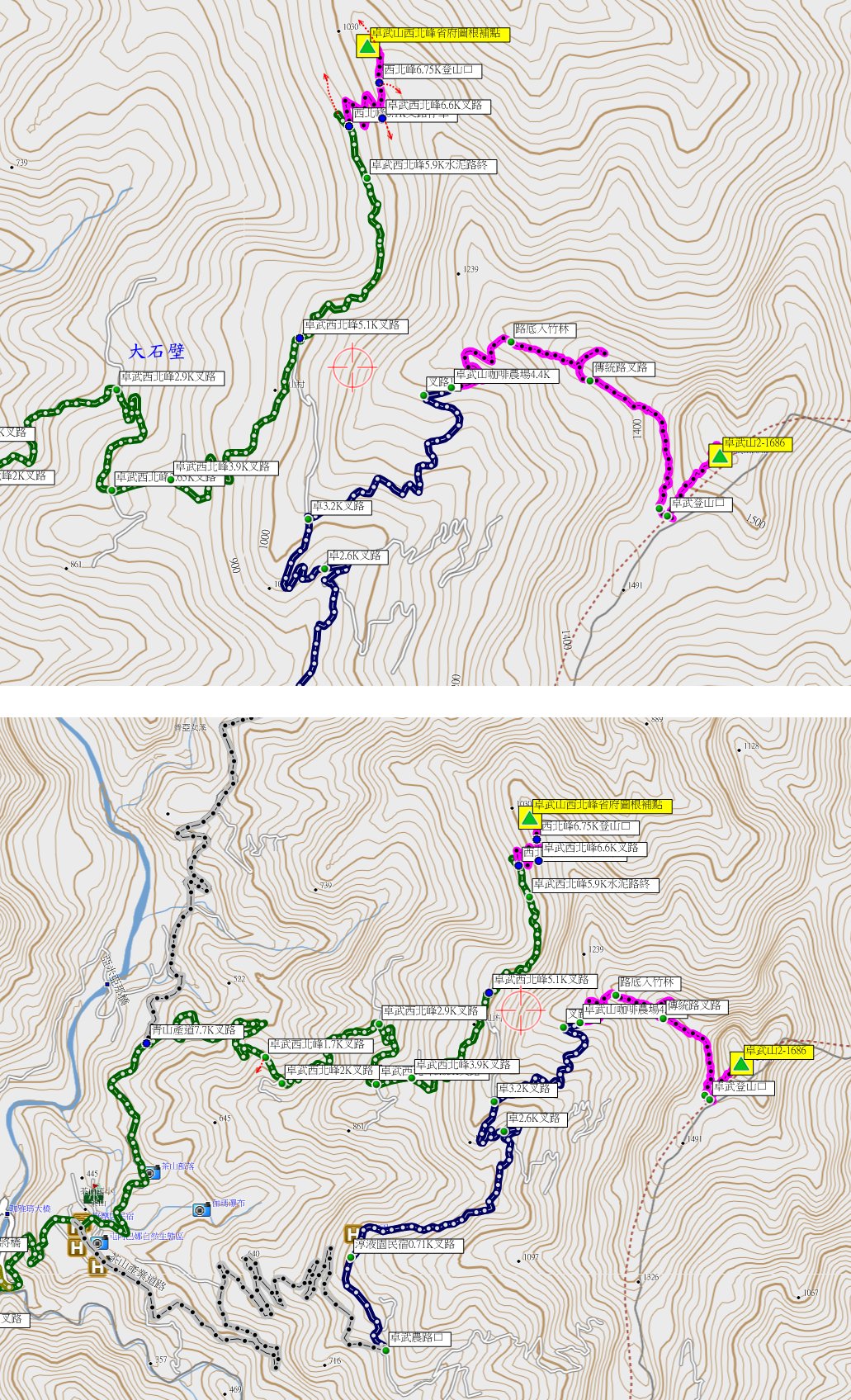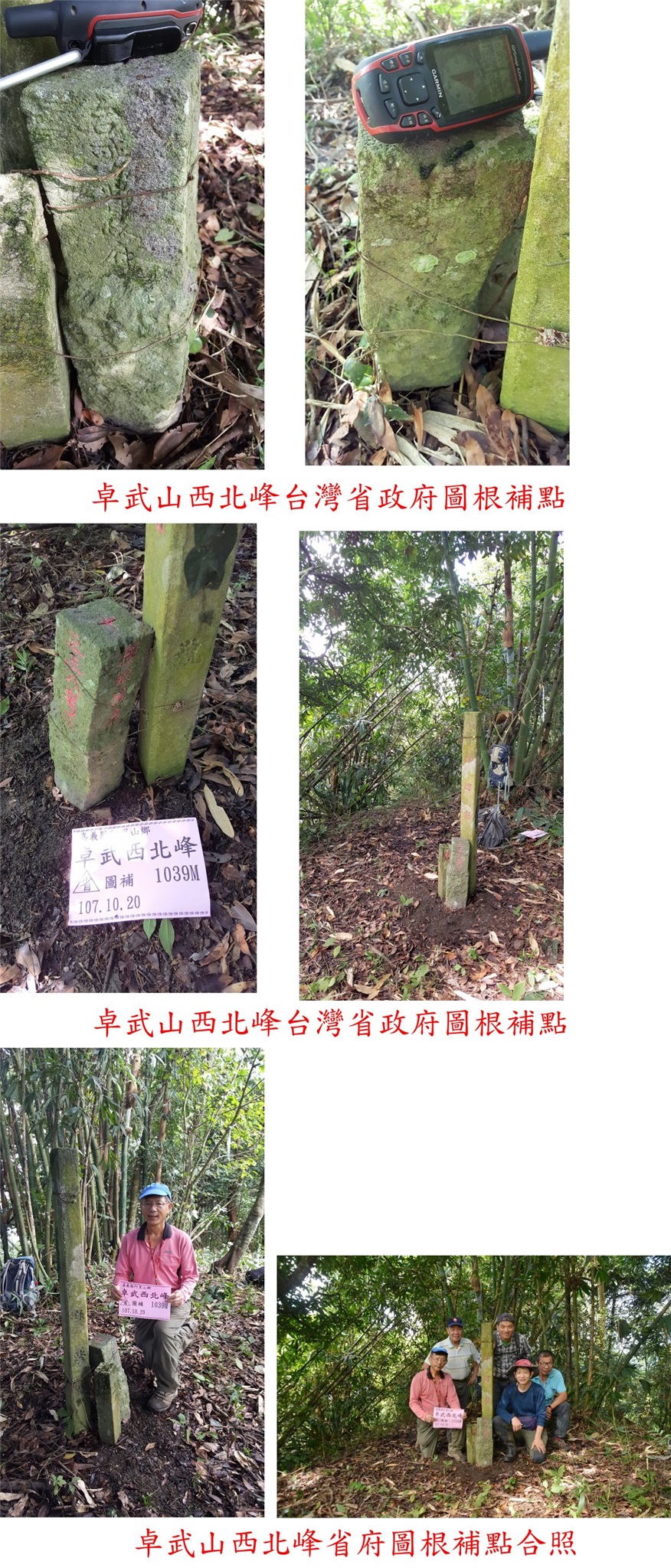 3、卓武山西北峰:位於嘉義縣阿里山鄉,標高1039尺,台灣省政府圖根補點;座標218002 2580036。