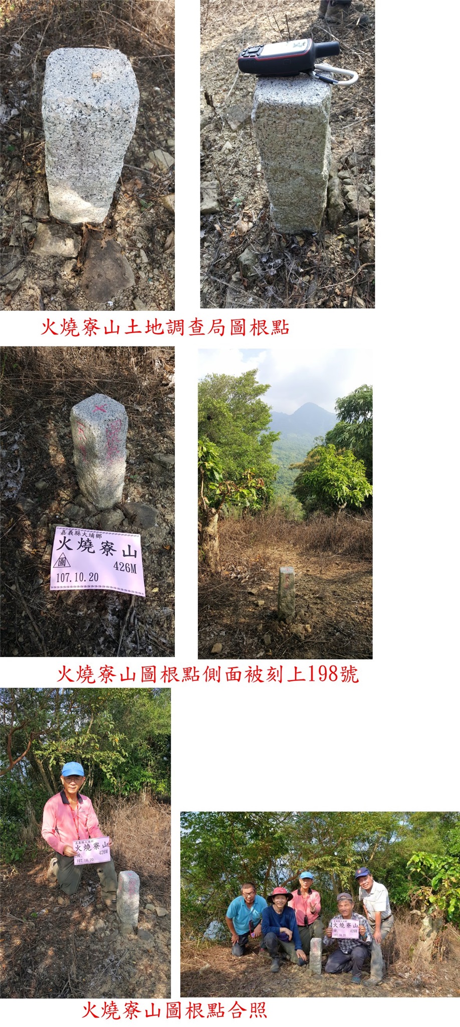 5、火燒寮山:位於嘉義縣大埔鄉,標高426公尺,土地調查局圖根點;座標204889 2573658。