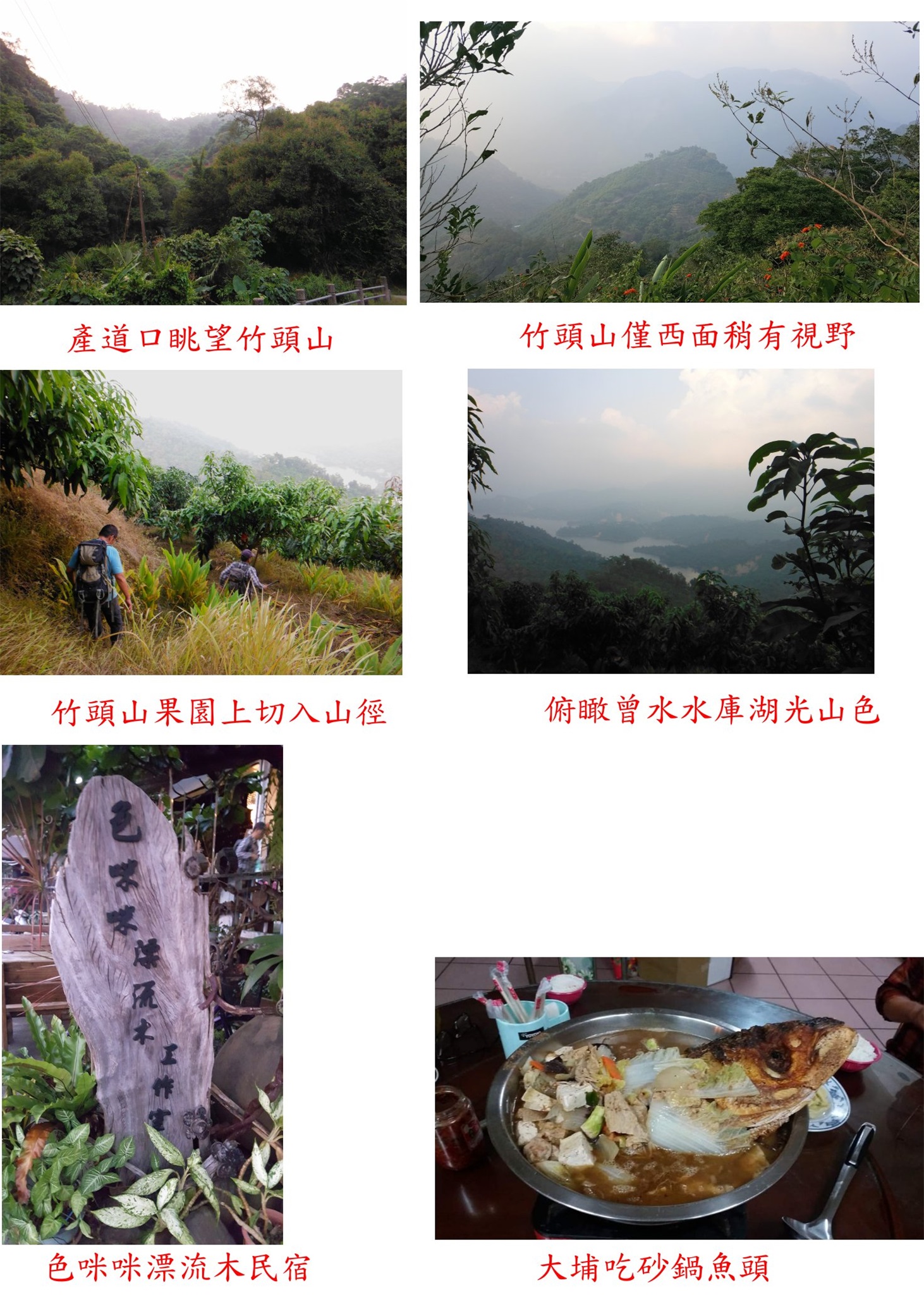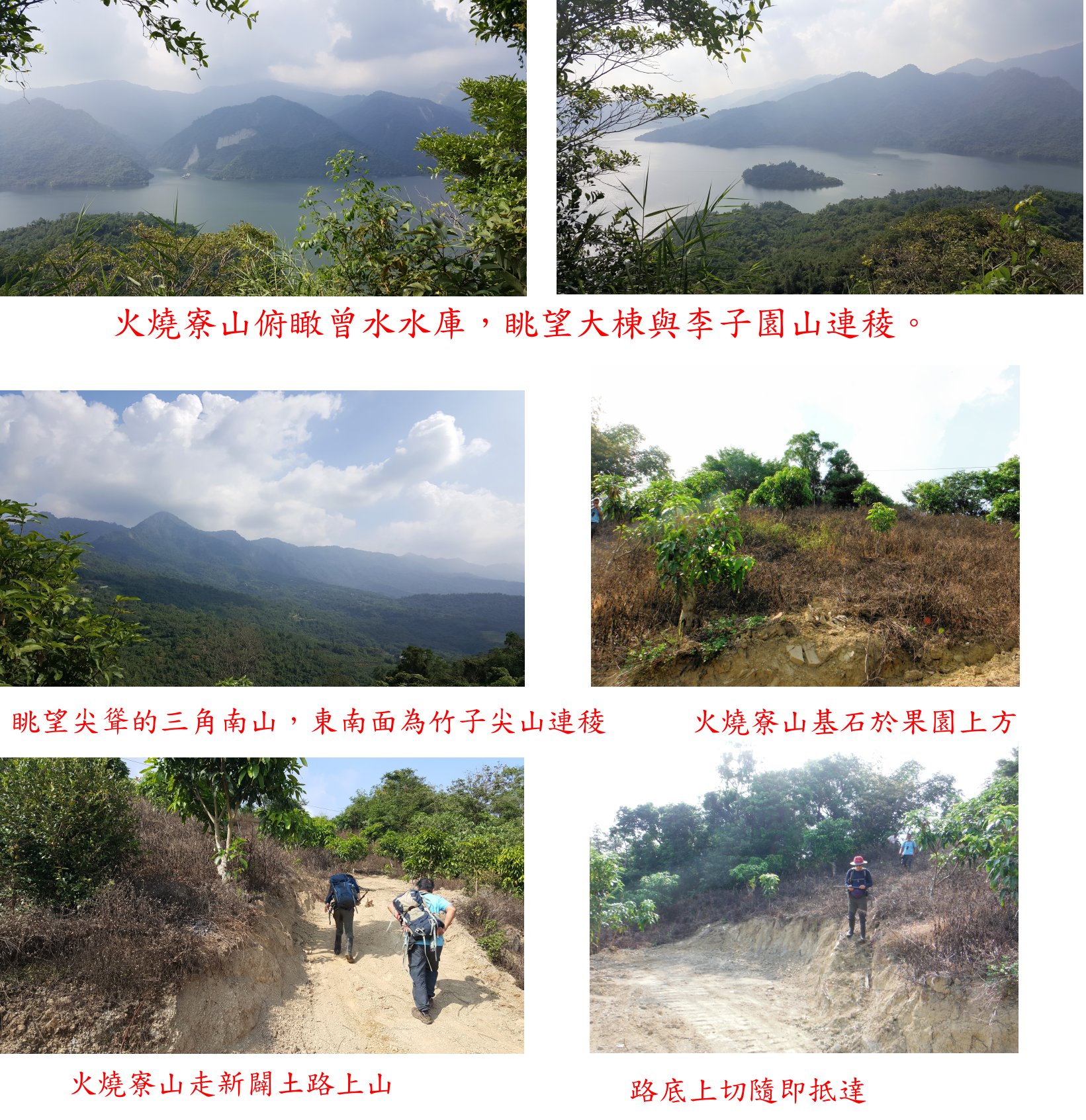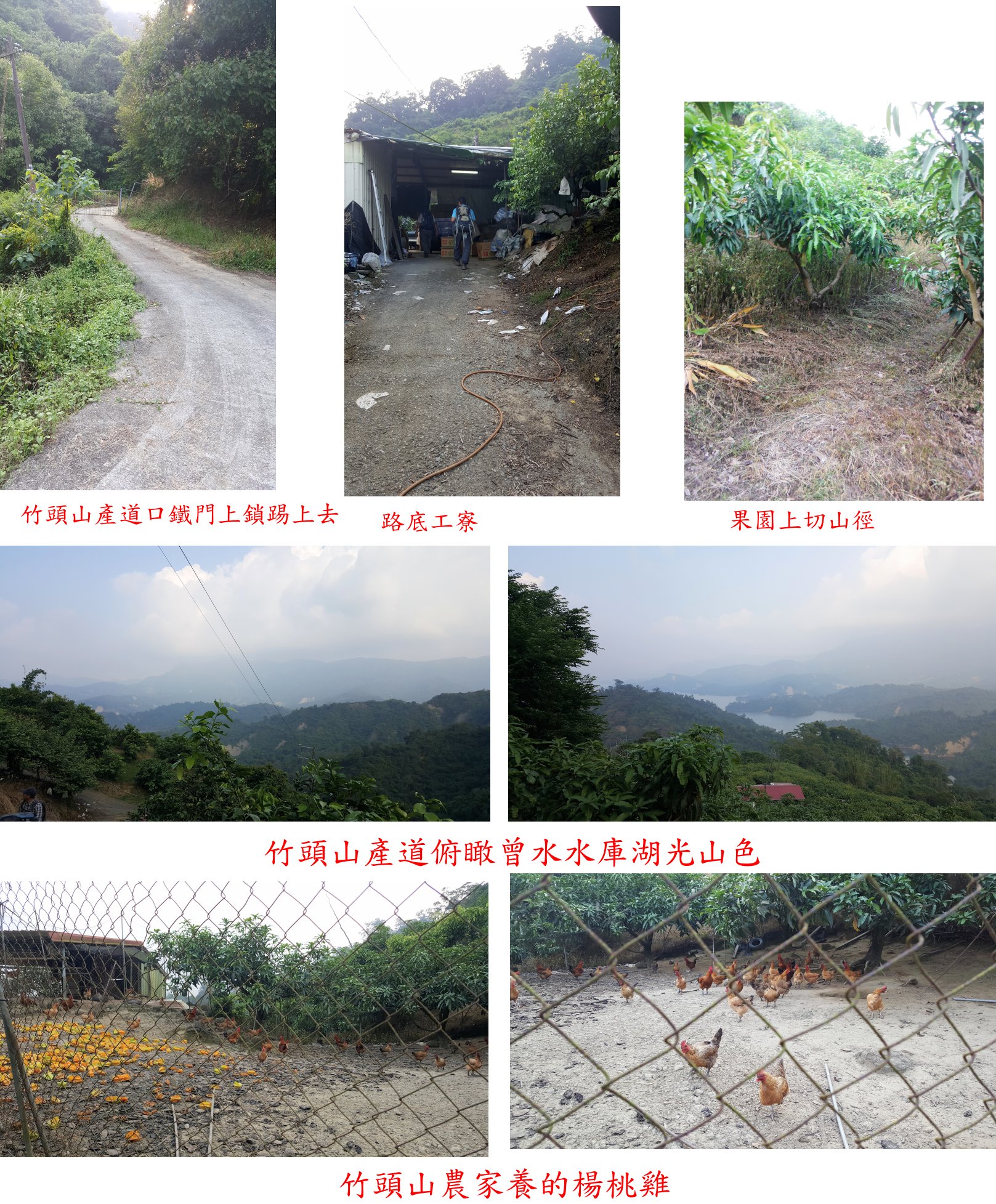 取左水泥農路上坡,沿途為果園(前段為葡萄柚、再上去轉為楊桃果園),俯瞰曾水水庫湖光山色,農繞盤繞往上走0.8K抵果園工寮,此段路走18分鐘,如鐵門未關車可抵達;遇到果農夫妻於工寮包裝採收下來的楊桃,請我們吃甜度高且多汁的大楊桃,吃完續走百公尺為養雞場,餵食楊桃;取右果園的小水泥路盤繞往上走