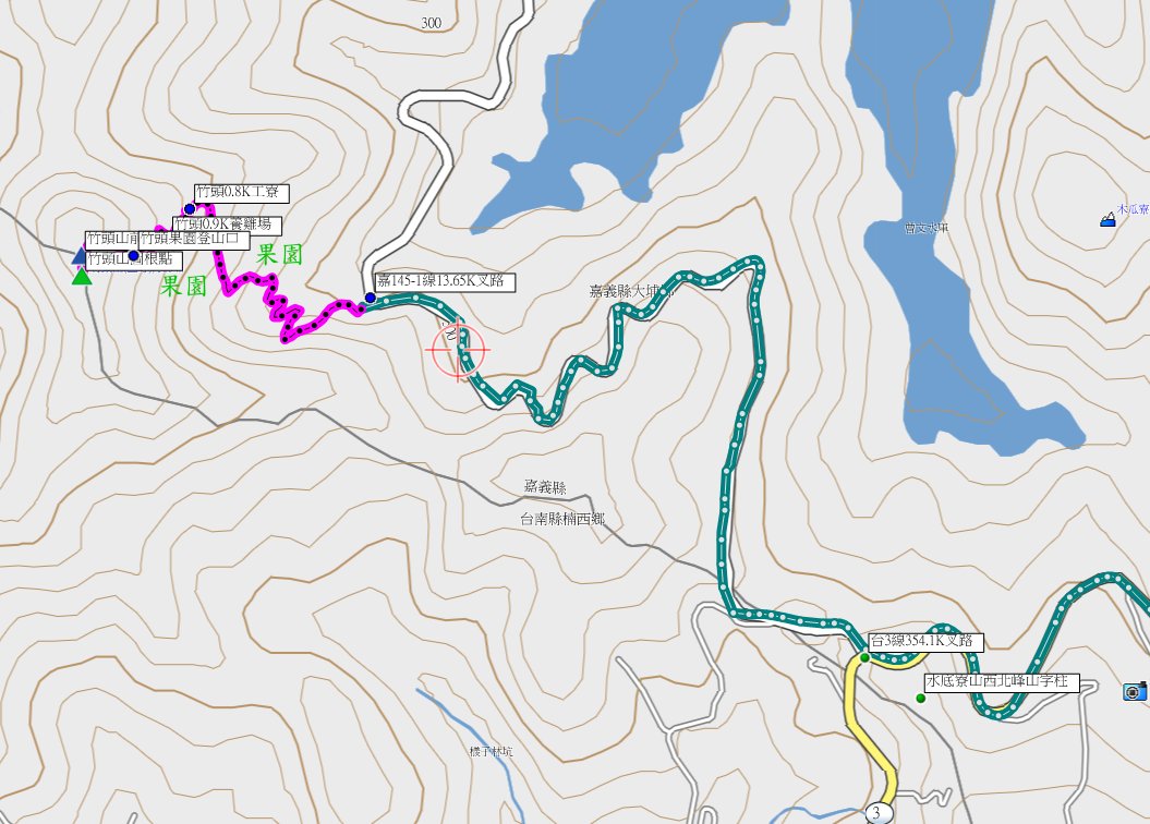 7、竹頭山:位於嘉義大埔與楠西交界處,標高519尺,土地調查局圖根點與曾文溪水源保護區界樁;座標201197 2570194;另有竹頭山前峰山字水泥柱,高514公尺,座標201196 2570231。
