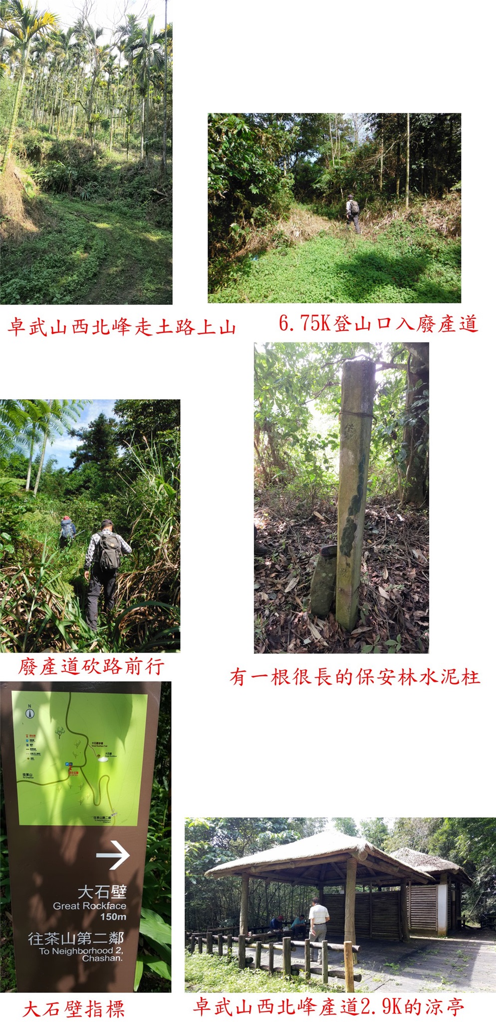 取右上坡的土路走0.5K檳榔園叉路(6.6K),取左續行至6.75K登山口,4W車可抵達,右土路不取;取左廢棄土路砍路前行走約