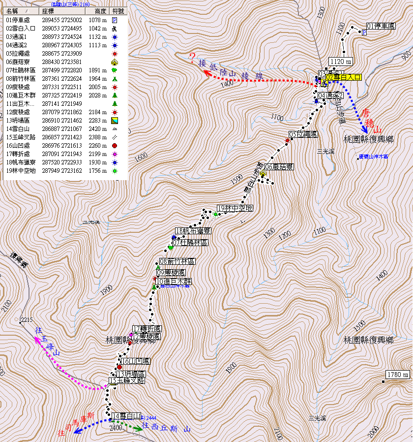 四、本次行程航點資料因受地形及天候影響,GPS於去程之收訊較回程之收訊差,故大部份均取回程之航跡,以致航點資料順序較亂。