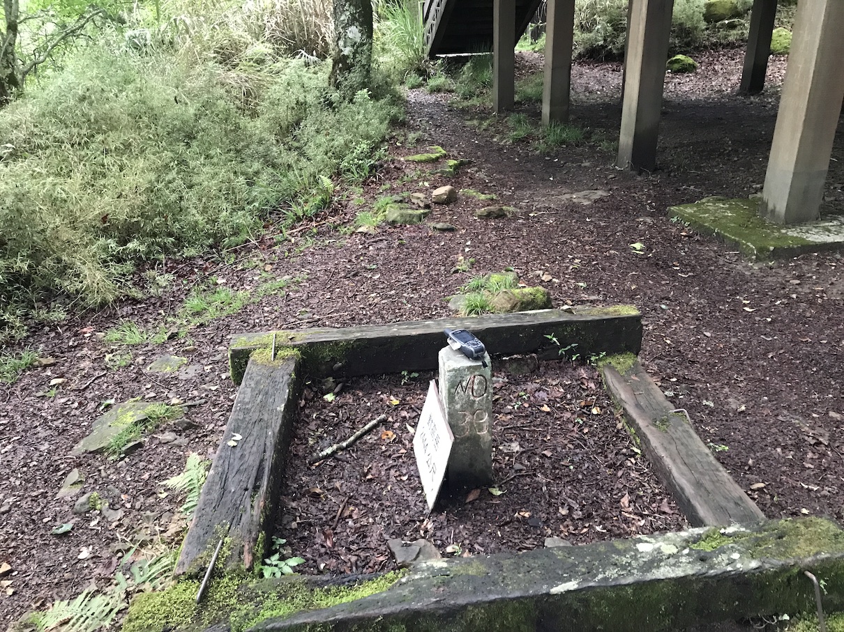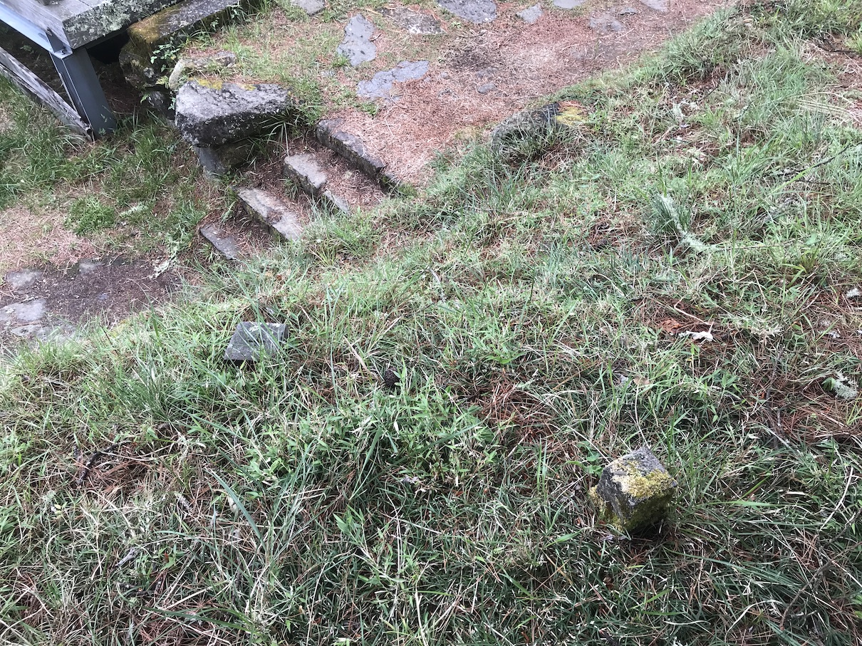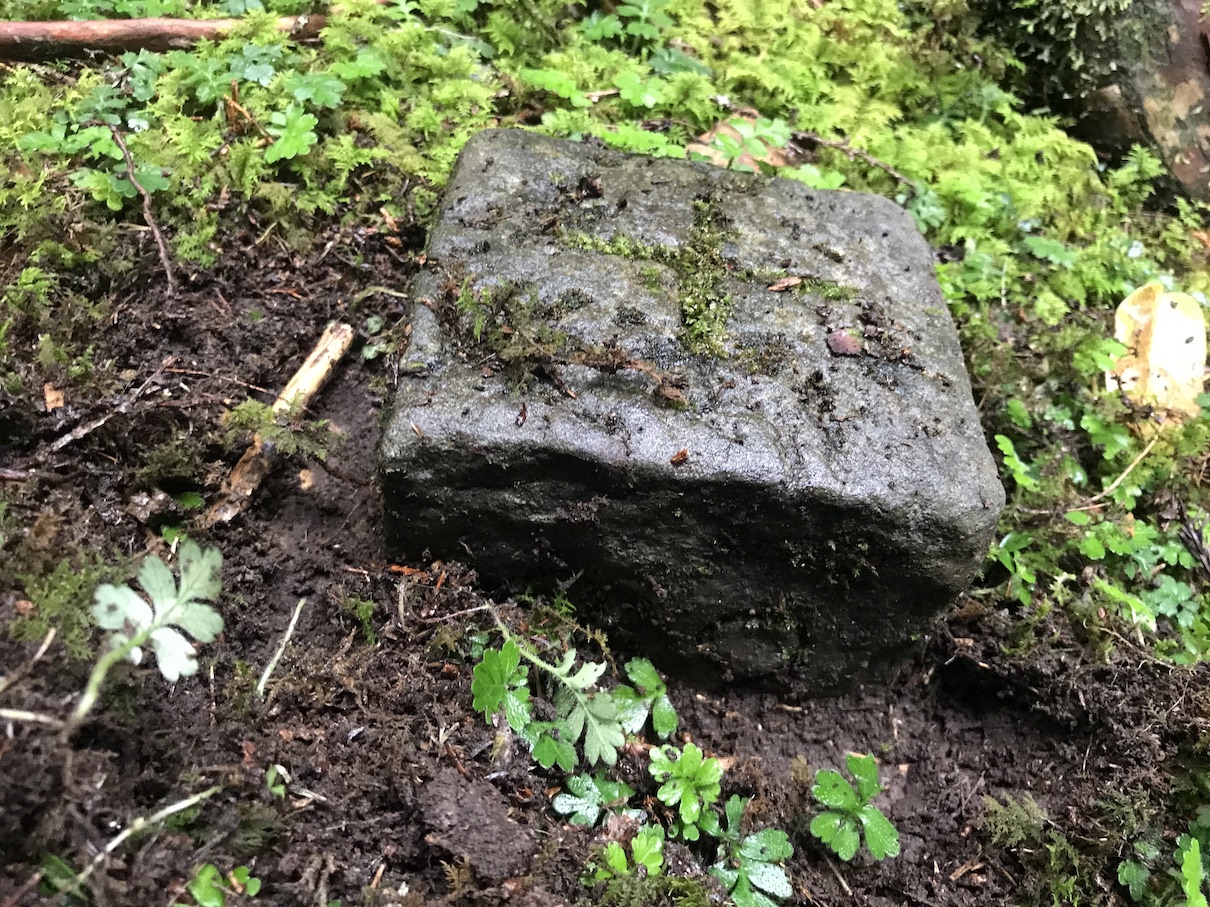 可見到一被青苔完全包覆的柱狀物,剛開始以為是被鋸斷的樹木,拿登山杖稍微捅一下,發現竟然是硬物,將厚厚的青苔完全移除後,