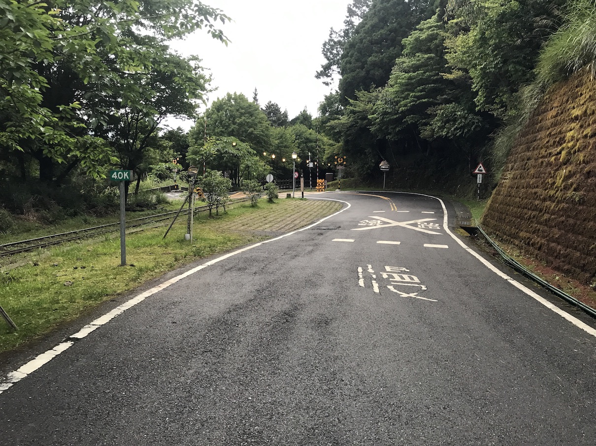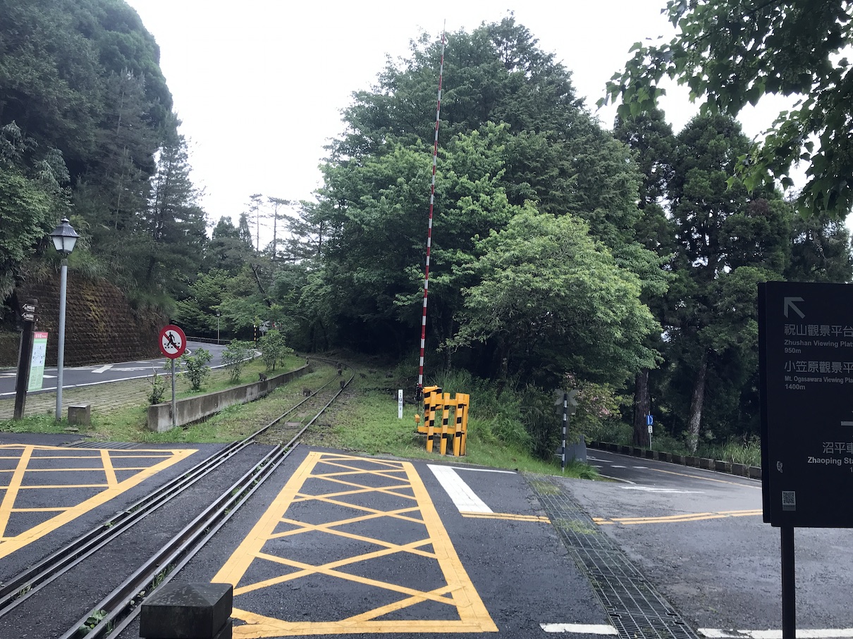 左轉沿祝山林道緩上,向東北方走約250公尺到林道右彎處遇祝山線的鐵路平交道(約祝山林道3.95K處),
