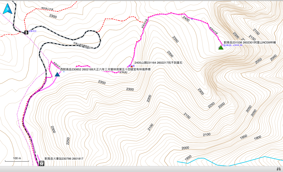 尚請見諒)。右轉過鐵路後沿對高岳步道陡上,走約150公尺到西對高岳最高點的東北方約15公尺處的步道上,右轉沿稜線自行找路向西南方緩上,走約15公尺到西對高岳的最高點,沿稜繼續向西南方緩下,