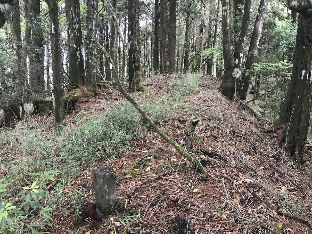 因為它不是在最高點,而且頂部是圓錐狀,不是平的,看不出來像基石,加上被厚厚的青苔完全包覆,很容易誤以為是砍伐後的樹幹。