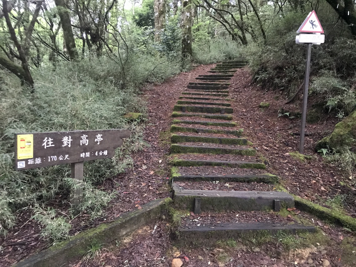 原路回到對高岳步道,繼續沿對高岳步道往對高岳的方向走,先向北緩下到對高岳步道0.6K指示柱處,再陡下到最低鞍部的對高岳步道0.7K指示柱處,然後向東轉東南方緩上,