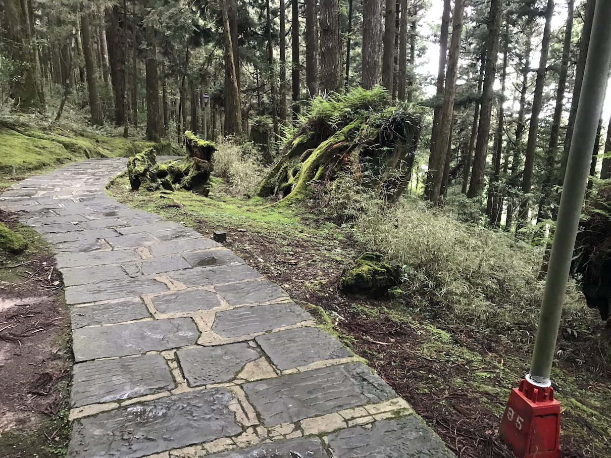 由沼平東南的32石柱處繼續沿祝山觀日步道上坡,經老樹頭,走約400公尺即將右彎時,
