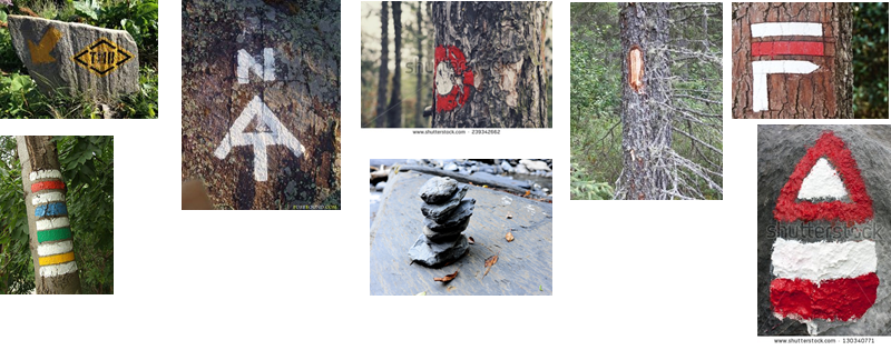 遊走歐美國家多年, 所看到的各種登山標誌, 除了公務單位在重要路口設立的叉口指示牌外, 一般民間為加強指點迷津, 根據各種地形地物, 最普遍的不外乎幾種: 堆石, 塗漆, 樹痕等