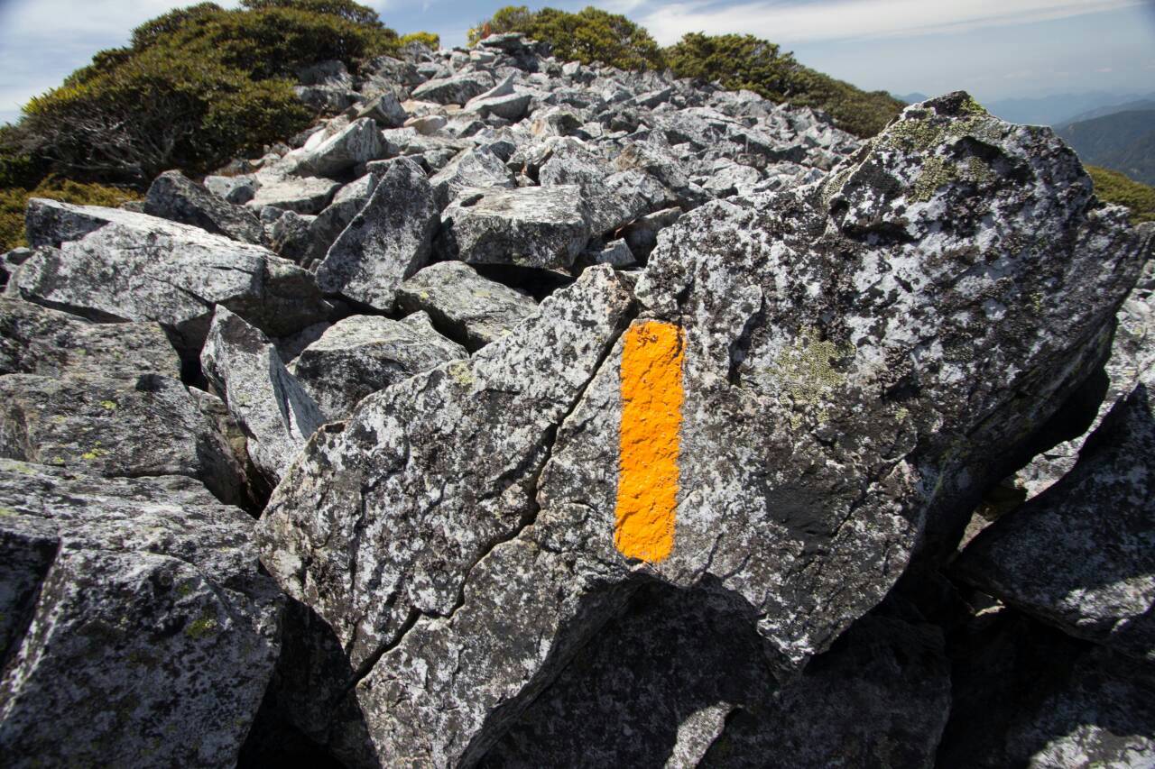 今年4月中旬,與幾個朋友去爬大小劍,由三六九山莊經雪山主峰去大劍,由大劍山往油婆蘭的稜線上看到不少個漆在岩石上的橙色路標,接近鞍部箭竹坡又發現幾支立竿,竿頭噴澄色油漆,極為醒目。爬山四十餘載,在山林裡最常看到紅、黃、藍、白、甚而彩色膠條指引登山客,各色布條混亂、汙染、又容易誤導,因此布條