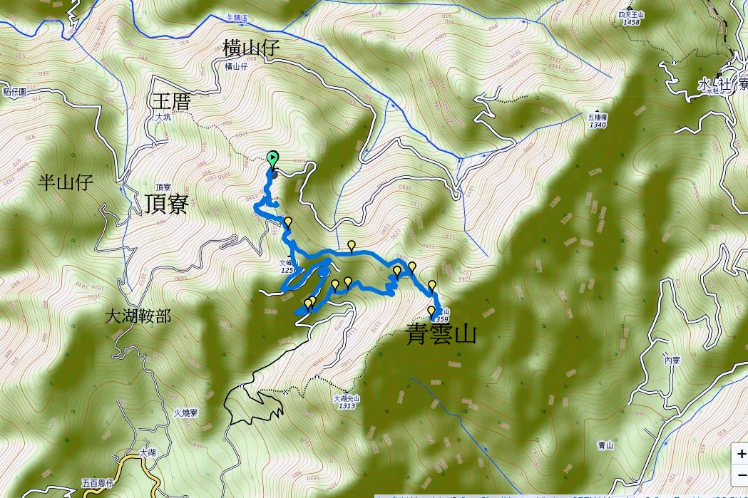 在童年的記憶中,這山頂附近這一帶,我們村人都稱之為頂寮山,由上面這張圖可以看出,從文峰山頂可分出三條稜脈,往西到大湖鞍部再分南北向支稜,往東延伸銜接青雲山,東西走向的稜脈為界,南邊屬於八掌溪流域,北面則是牛稠溪流域。再看從文峰山往北過凌雲岩經橫山仔延伸下到牛稠溪這條軸線的西側則有三條支稜,每條支稜都有一個聚落,即橫山仔、王厝、頂寮,再加上對面西邊的半山仔,這四個聚落的組合就是所謂的大坑庄,行政區域隸屬竹崎鄉文峰村,這樣的配置則和原住民的部落分布有異曲同工處。