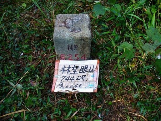 08:12~08:22 林望眼山基點(又稱福山 H744M 三等三角點NO.6254),有雨量測量站及一等衛星控制點不鏽鋼標記。山頂幾無視野,全員到齊後,拍照後回到叉路口續往北插天山