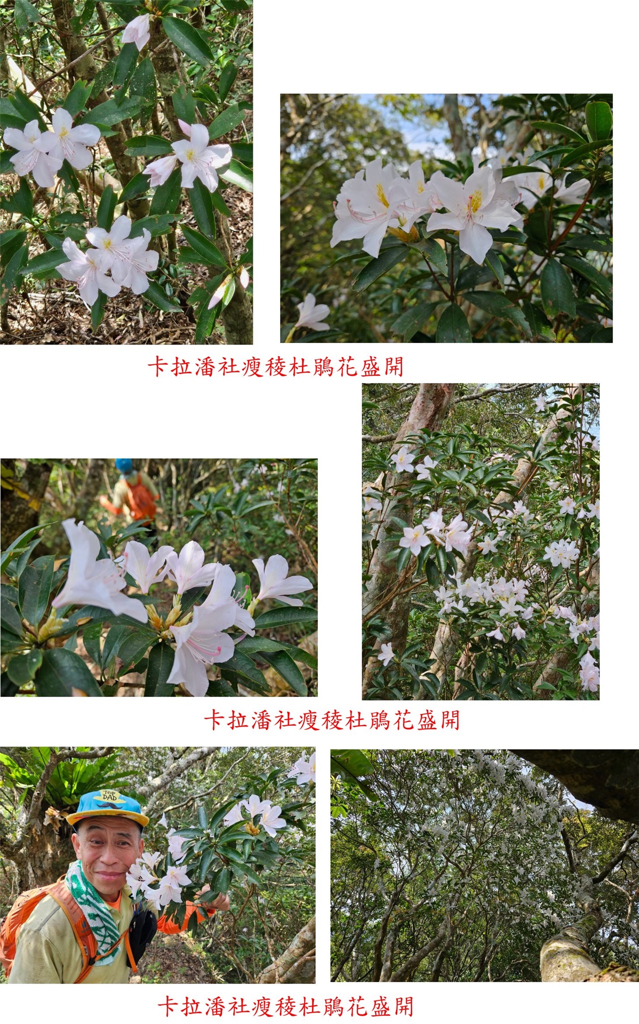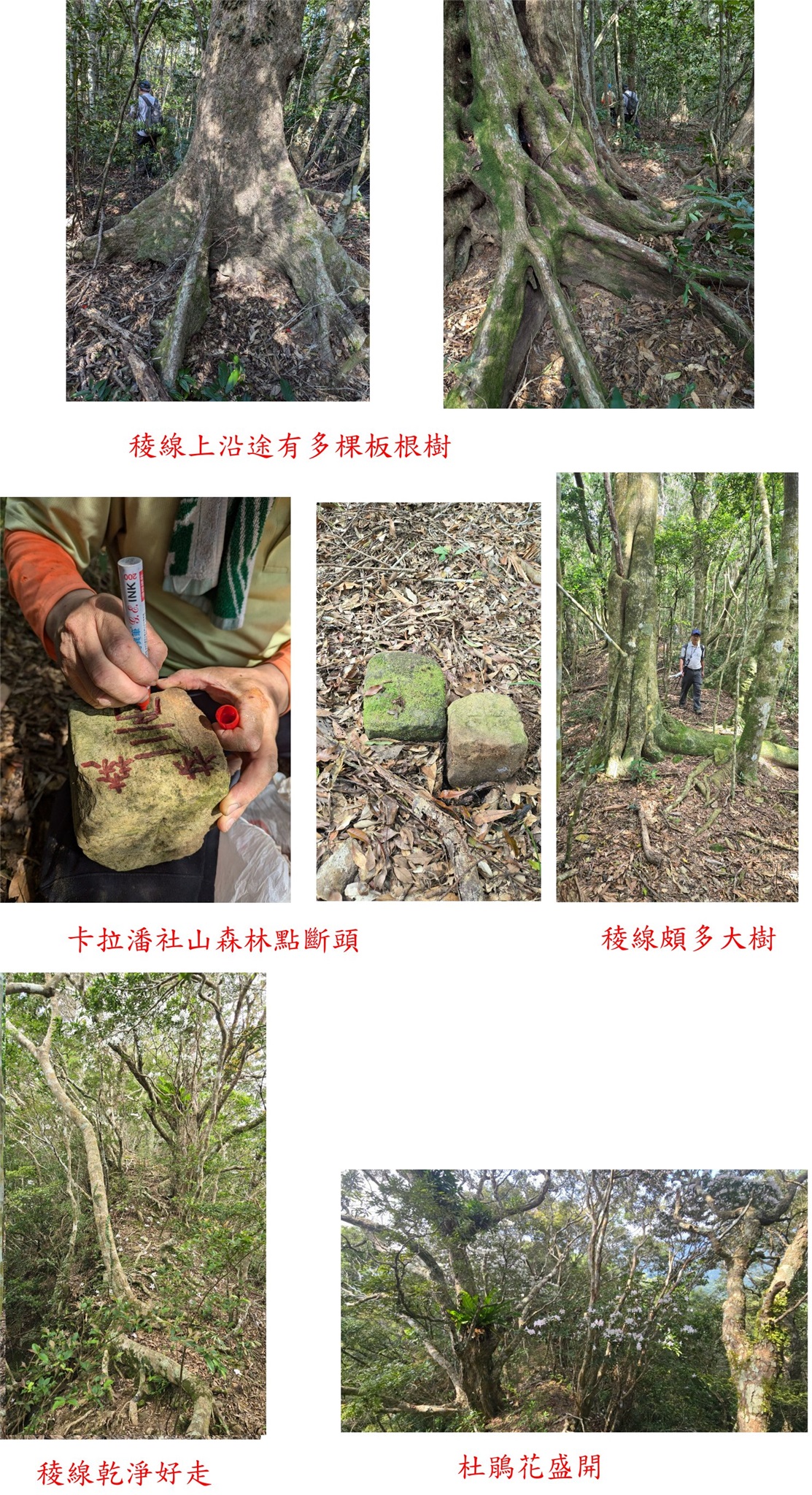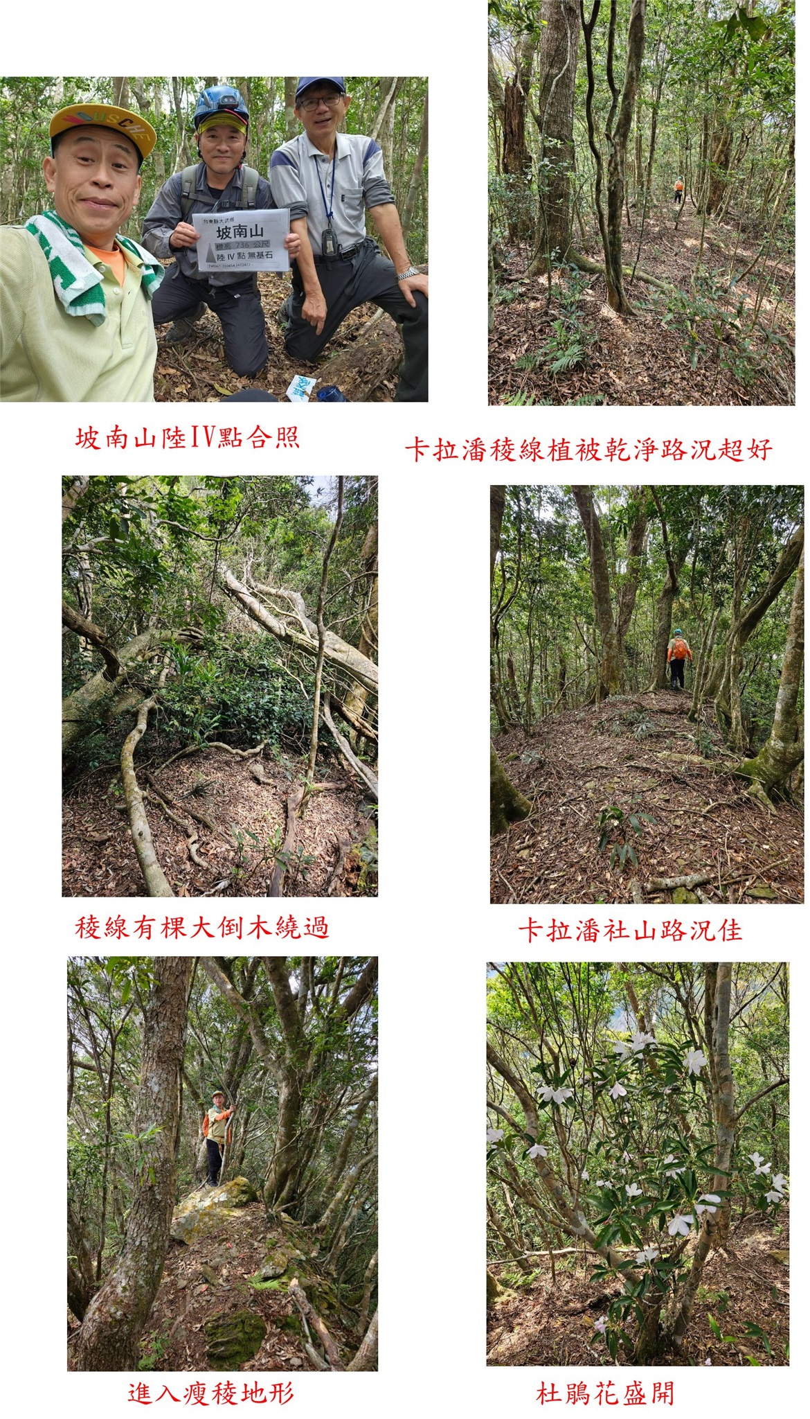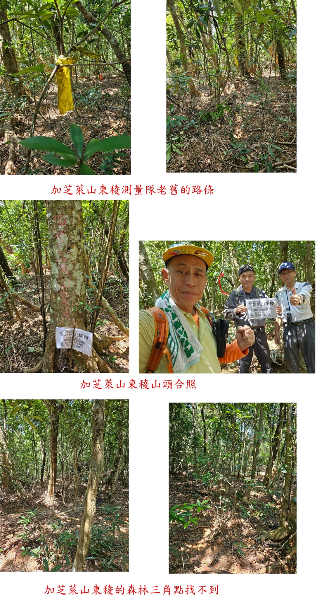 3/22-3/24約山友到台東爬山,第三天(3/24)去探勘加芝萊山東稜的4座山頭,此稜無山友紀錄,嘗試連稜尋訪此稜資料上的2顆森林點;第1座為加拉坂山的省政府圖根補點,由大武經加羅板部落過加羅板大橋,左轉農路至5.2K土叉路停車,取右廢產道數度上切,最後於1.55K處跨越廢產道,隨即抵達基石,此點隊友都曾來過順路再登,上山走50分鐘;第2座為加芝萊山東稜的森林三角點,廢土路走百餘公尺路底,順寬稜緩上自行闢路,植被尚稱乾淨不難走,沿途翻越2座小山頭,走約3小時抵達加芝萊山東稜森林點座標處,基石資料庫標示此點尚存特來尋找,山頭平緩且植被乾淨,找了49分鐘就是找不到基石,走好遠沒找到有夠鬱卒;第3座為坡南山陸IV點,續行山徑緩上走約70分鐘抵達,為一獨立山頭但找不到任何基石;第4座為卡拉潘社山的森林三角點,續行隨即接到阿標等山友4年前由加拉坂溪上山的路線,山頂前轉為瘦稜杜鵑花正盛開,走37分鐘抵達森林點,基石已斷頭,連稜走過來費時約7小時;拍照後原路回,回程走了3小時又41分鐘,連稜走了4座山頭,往返費時約11小時,奮戰許久今日只有1顆新的基石入帳。
