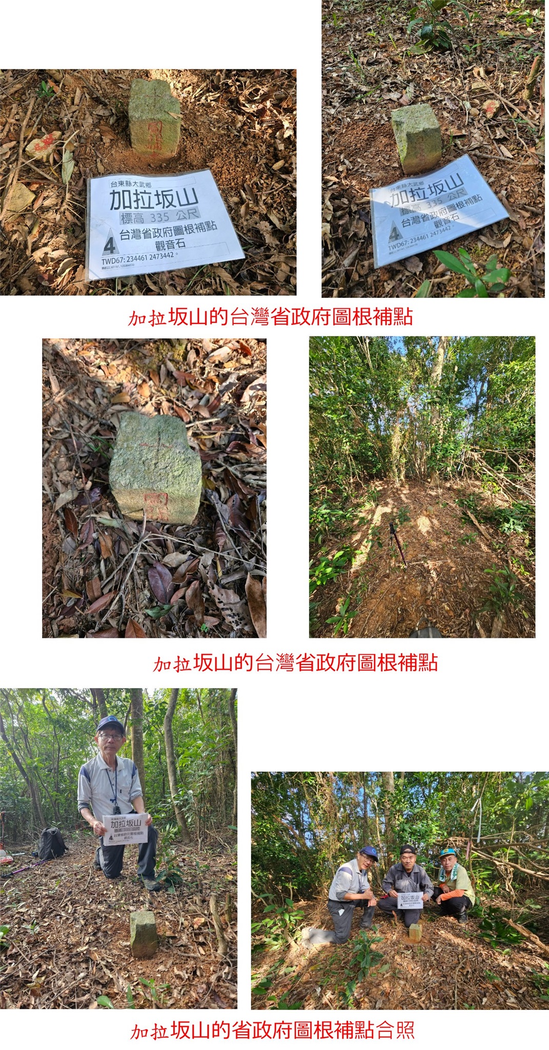 1、加拉坂山:位於台東縣大武鄉,標高335公尺,台灣省政府圖根補點;座標234465 2473445
