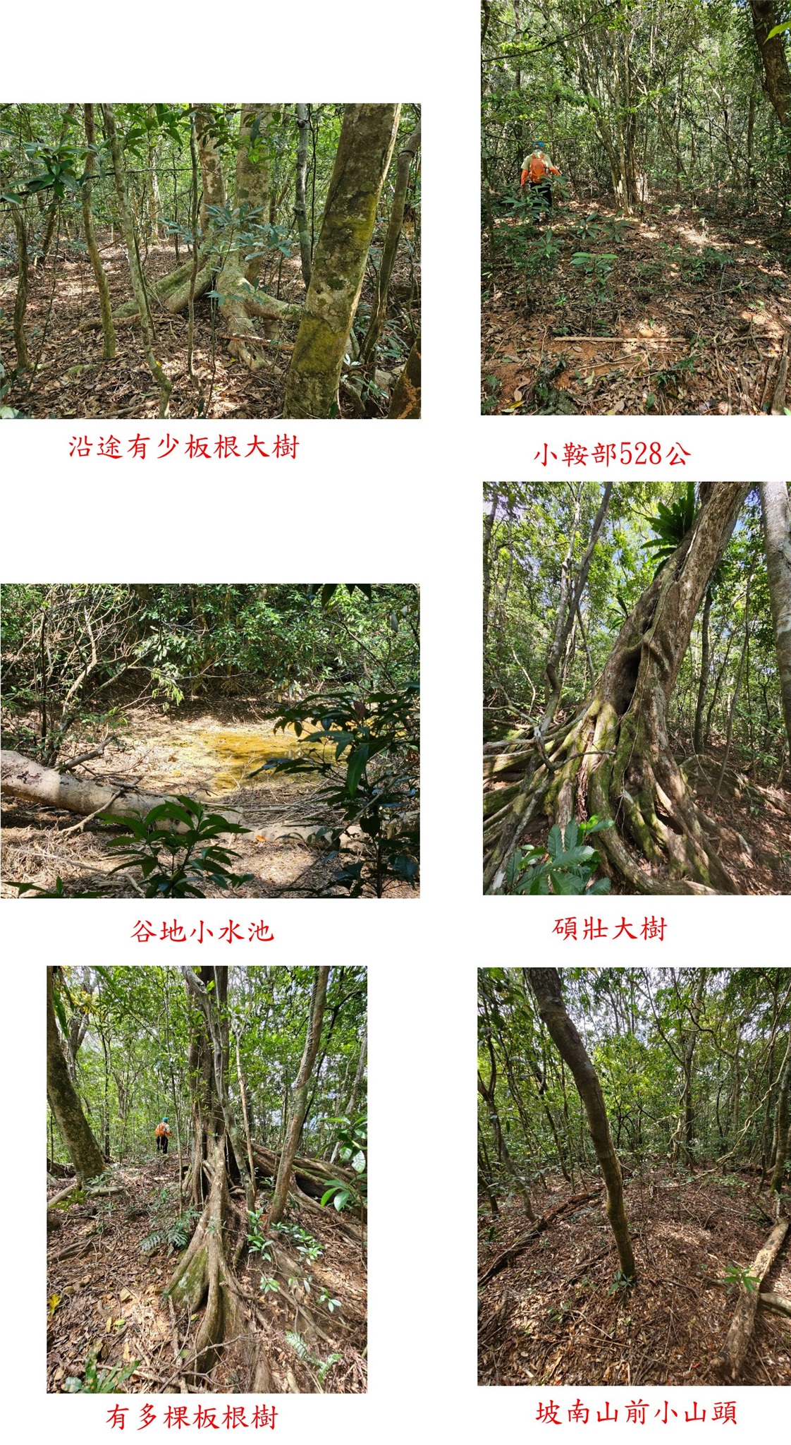 08:50崖邊展望處,高436公尺,左下方為崩塌地,西北面眺望中央山脈南段的佳菩安等山,南面為助矢等山,右前方為加芝萊山東稜等山頭;續行山徑轉為陡上,沿途有少板根大樹。