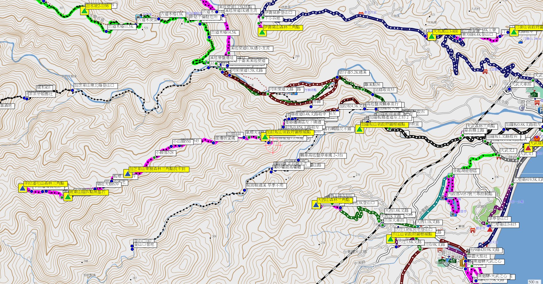 2、加芝萊山東稜:又稱姑仔崙社,位於台東縣大武鄉,標高580公尺,補沖(47)森林三角點找不到;座標2319502472854