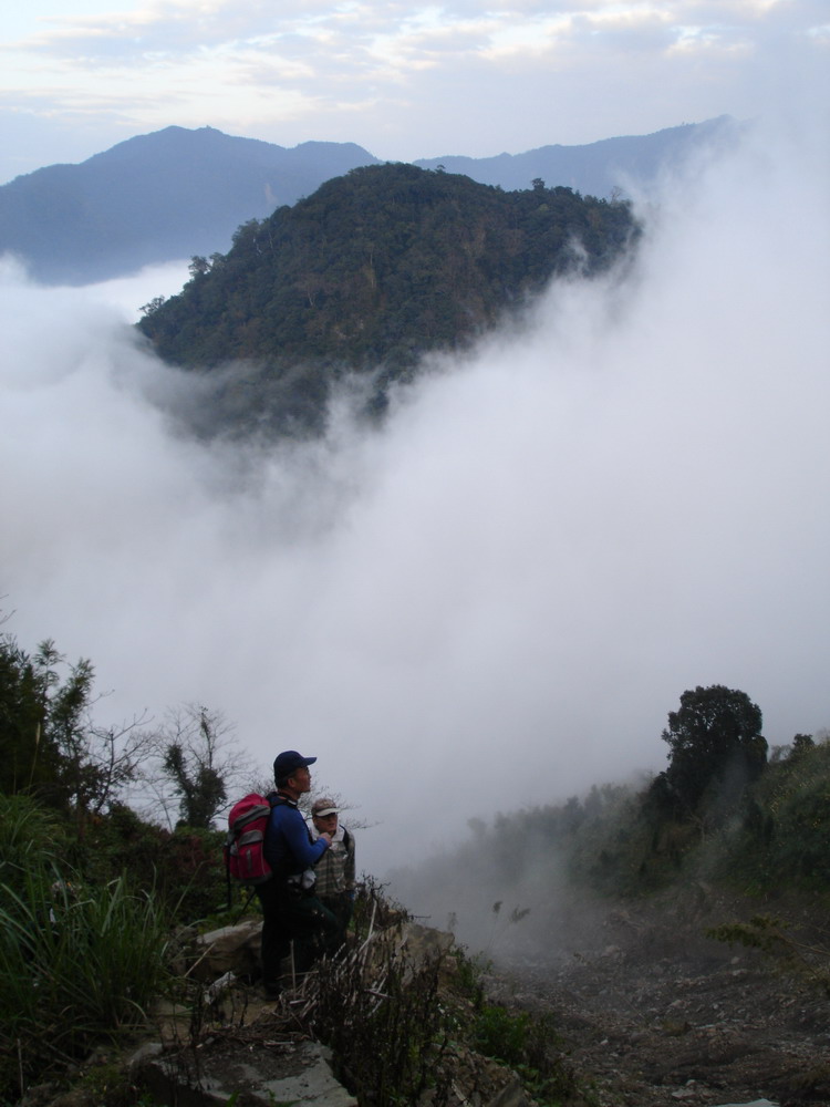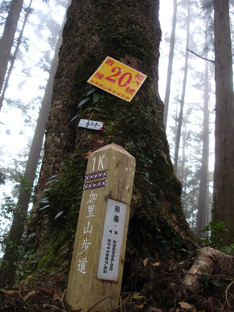 沿鐵道走一小段後,遇18號救援樁(鐵軌直行,可至4號救援樁,也可以上山,但須多花1個多小時),我們取右上山,仍是柳杉林,25分鐘後過乾溪,遇14號救援樁,接著陡上30分鐘路程,到11號救援樁,這裏的高度接近2000公尺,林向轉為原始林,遇巨石,景色與柳杉林不同,山徑也變平緩,十分鐘後來到9號救援樁,這裏是與鹿場傳統路線交會處,很多山友在此休息,準備最後的登頂。