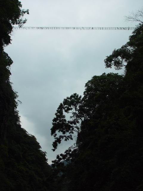 嚮導讓大家稍事休息後,從吊橋旁下切到溪邊。在溪邊仰望跨河凌空的吊橋,真可謂「兩山之間一線牽」。