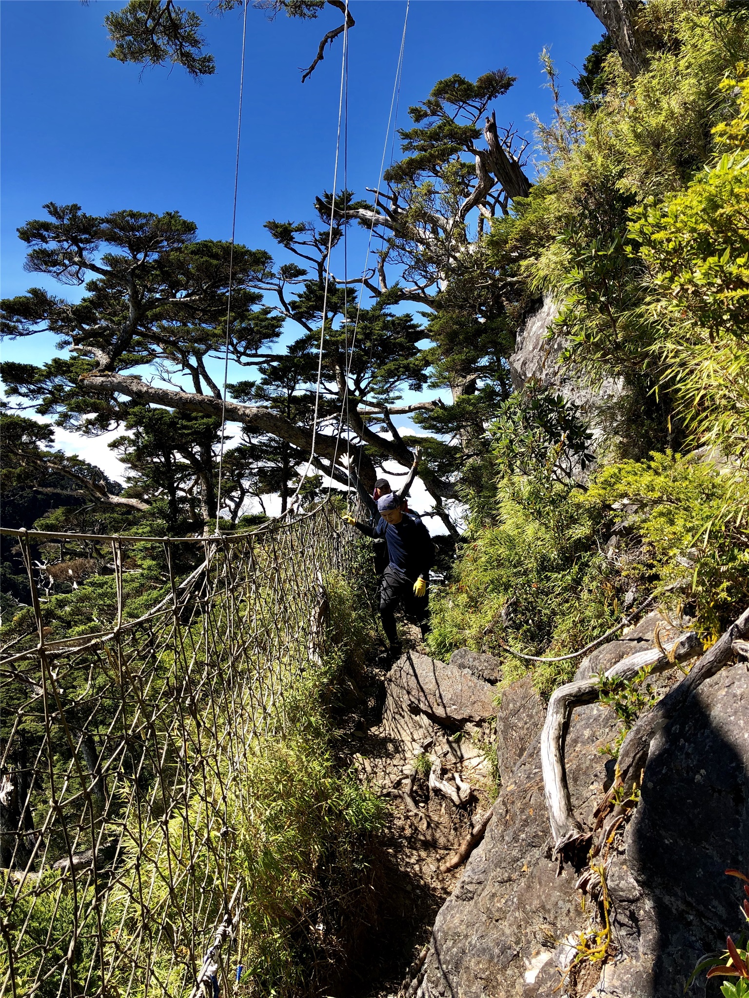 10:32橫渡岩壁(020),H2916 m,山徑左側是岩壁,右側是斷崖,還好有架好的繩網確保,小心通過並不難。